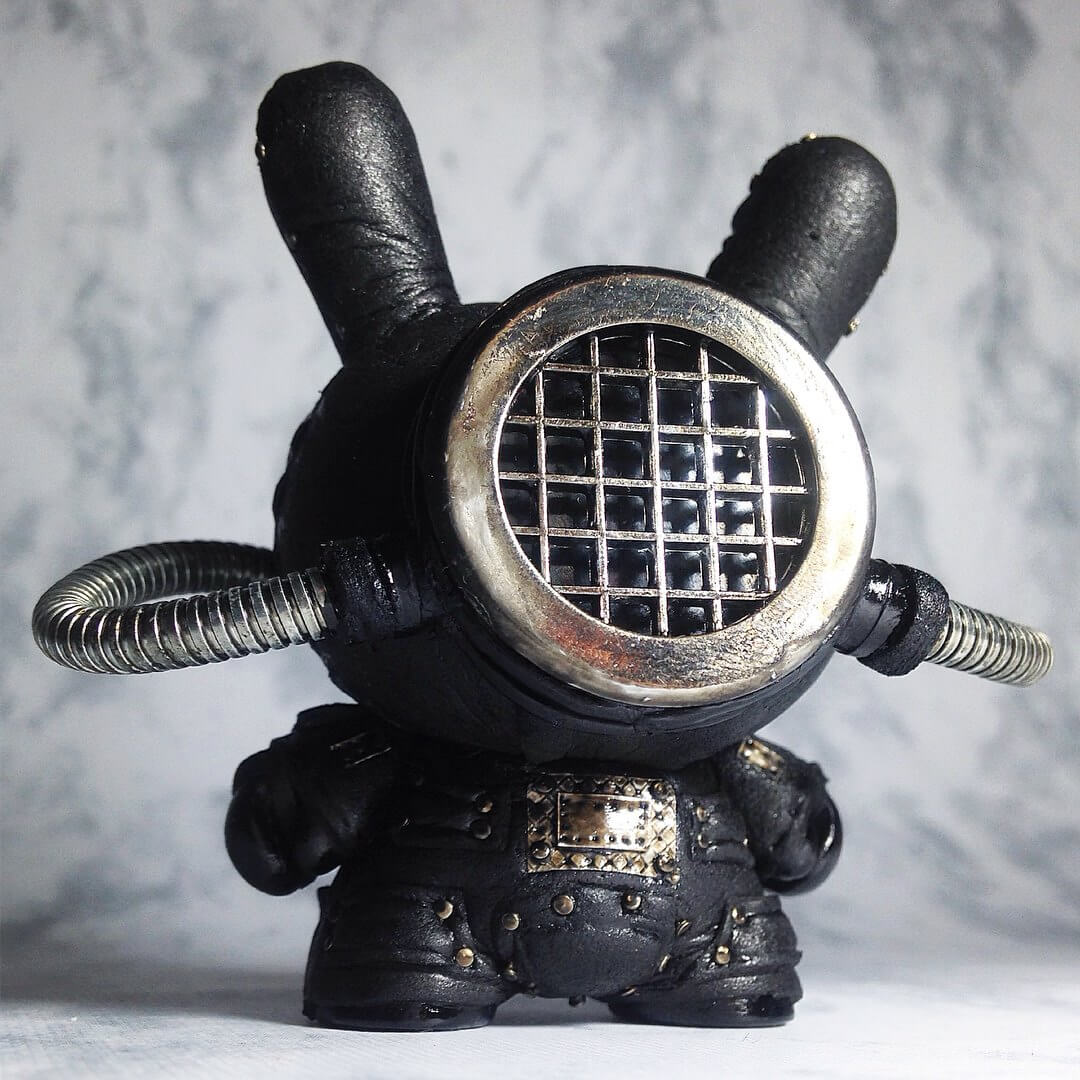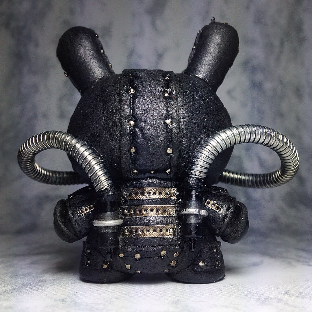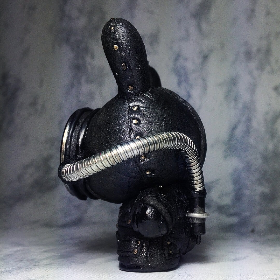 BREATH! Jump Jumper Ant once again pushing the classic Kidrobot Dunny to the untouched depths. Known for her darkness APSU is more than just an atmospheric diving suit APS on a Dunny. Is it just us that we see hints of Sadomasochism? Leather, metal and grunge all found on Jump Jumper Ant’s APSU Dunny.