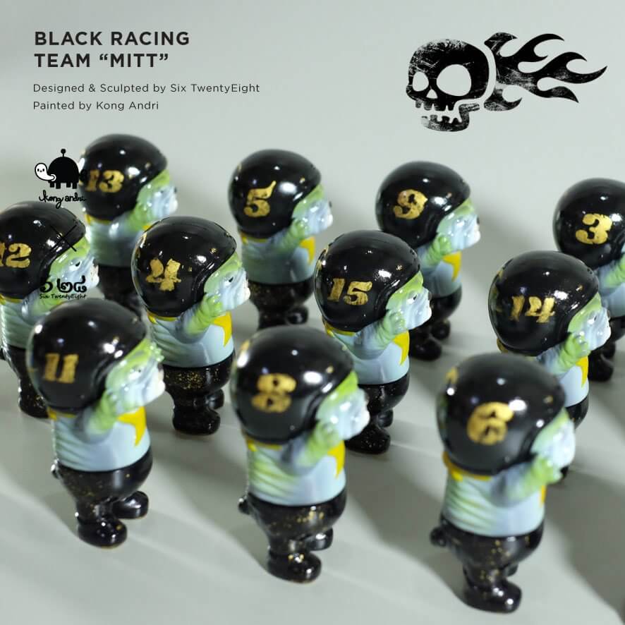 Fueled up and ready to GO! Kong Andri’s custom 6 28 “MITT” soft vinyl figures. Kong Andri Black Racing Team “MITT” each has a unique one of a kind number on the helmet with each set. The Black Racing Team is a much darker and sinister style in contrast to Kong’s last years sold out custom MITT Owange Racing Team.