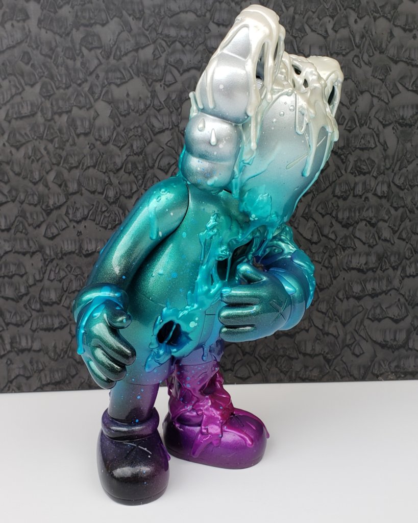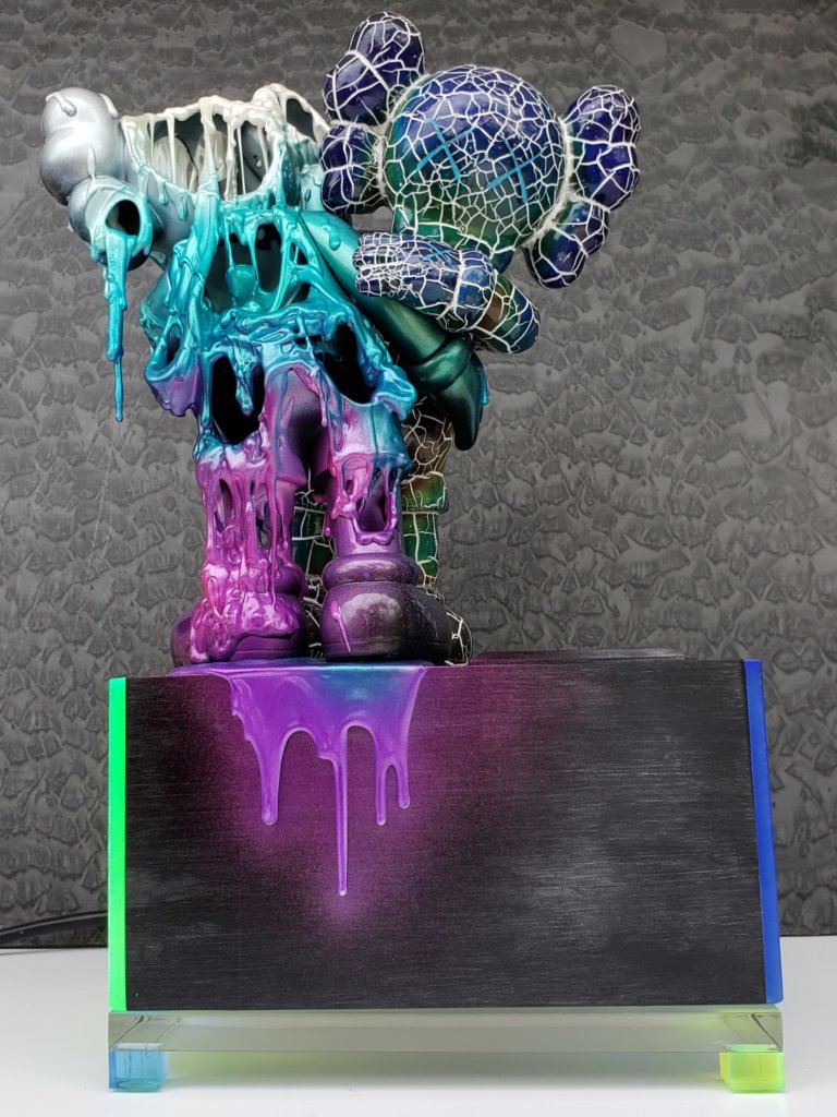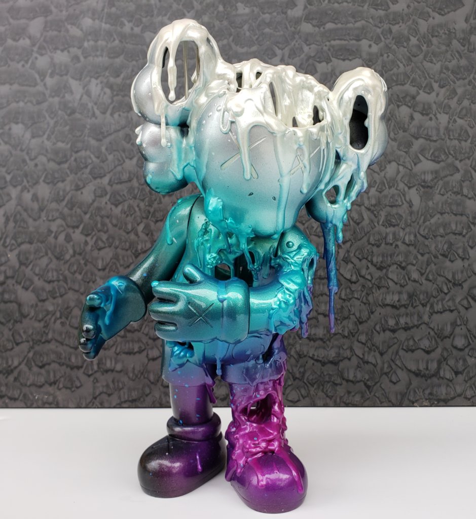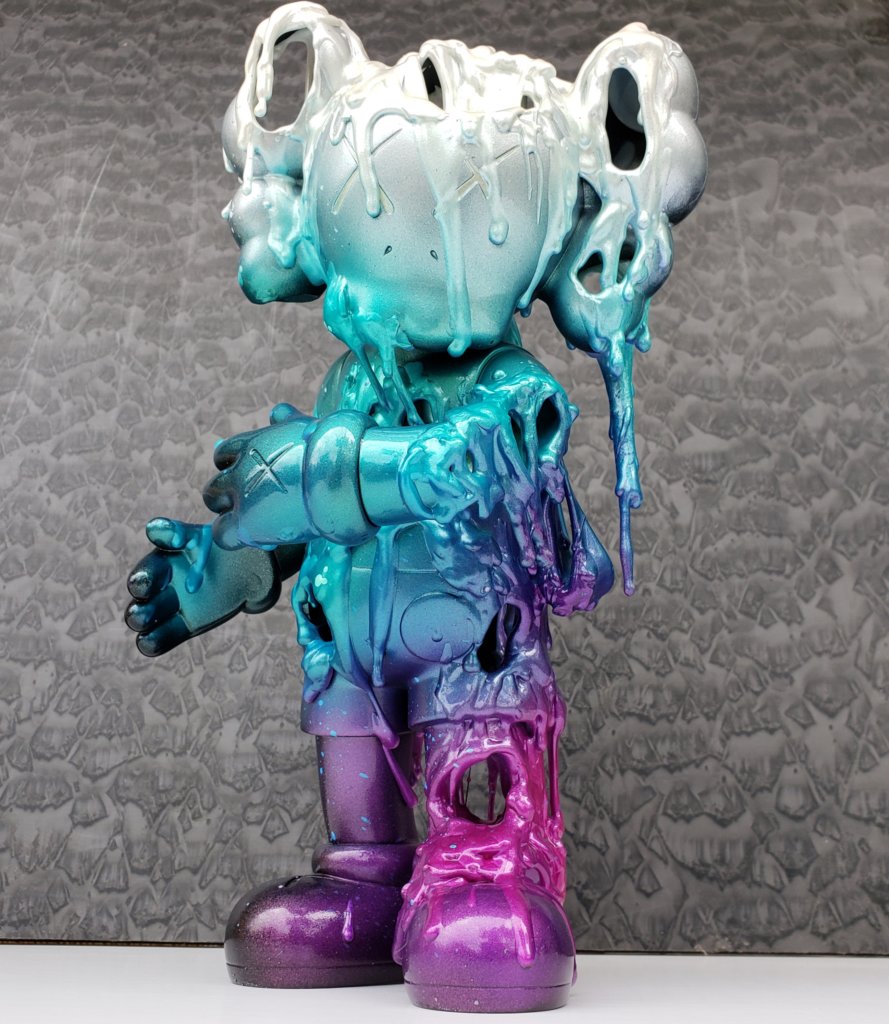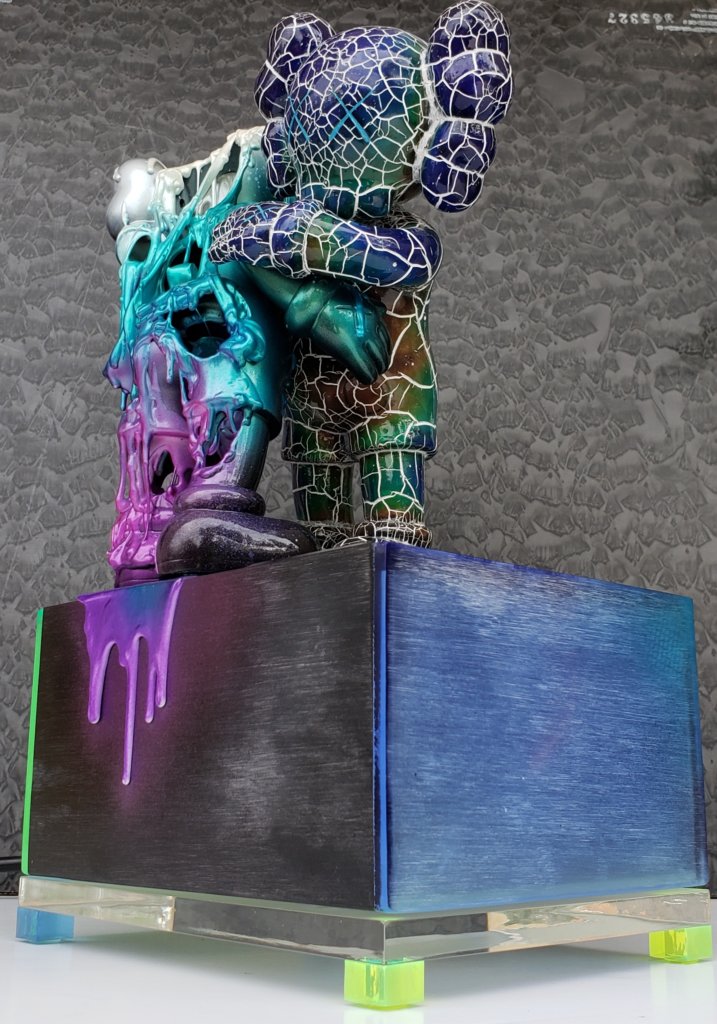 Jimi’s vision was to have KAWS Together companions customized in a way where when they hug, one gives life to the other. He wanted to express how one helping another can give life. In order to do this, I needed to customize one of them and the other would be done by Noah. Noah uses a thermal paint which varies in color due to temperature change. Once the pieces came “Together” Noah’s piece would instantly start to change colors, becoming full of life.