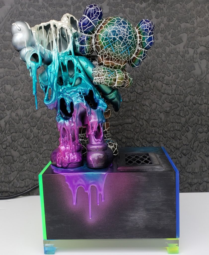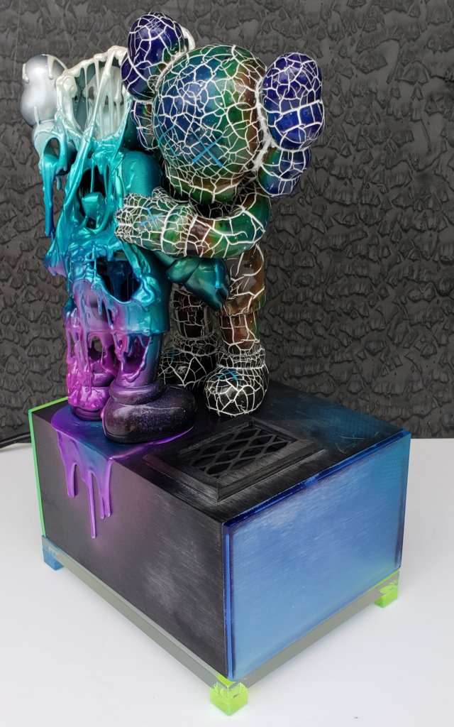 Since this was a little bit out of my skill set, I approached another artist and friend named Bob Schmitt AKA Robair. He has a background in engineering, so I asked if he would be interested in joining in on the collaboration. After testing a few different concepts, he designed a custom made box that would blow hot air onto Naptime Noah’s piece, causing it to change colors in a matter of seconds. How this works is, as you put the two pieces together, Noah’s piece would activate a switch installed on the top of the box. The switch then activates a built in heater and fan, which blows hot air onto Noah’s piece. He even added LED lights to the box to give it a cool look. Robair said he was excited to see his box come to life because of all the interesting challenges involved in the project.