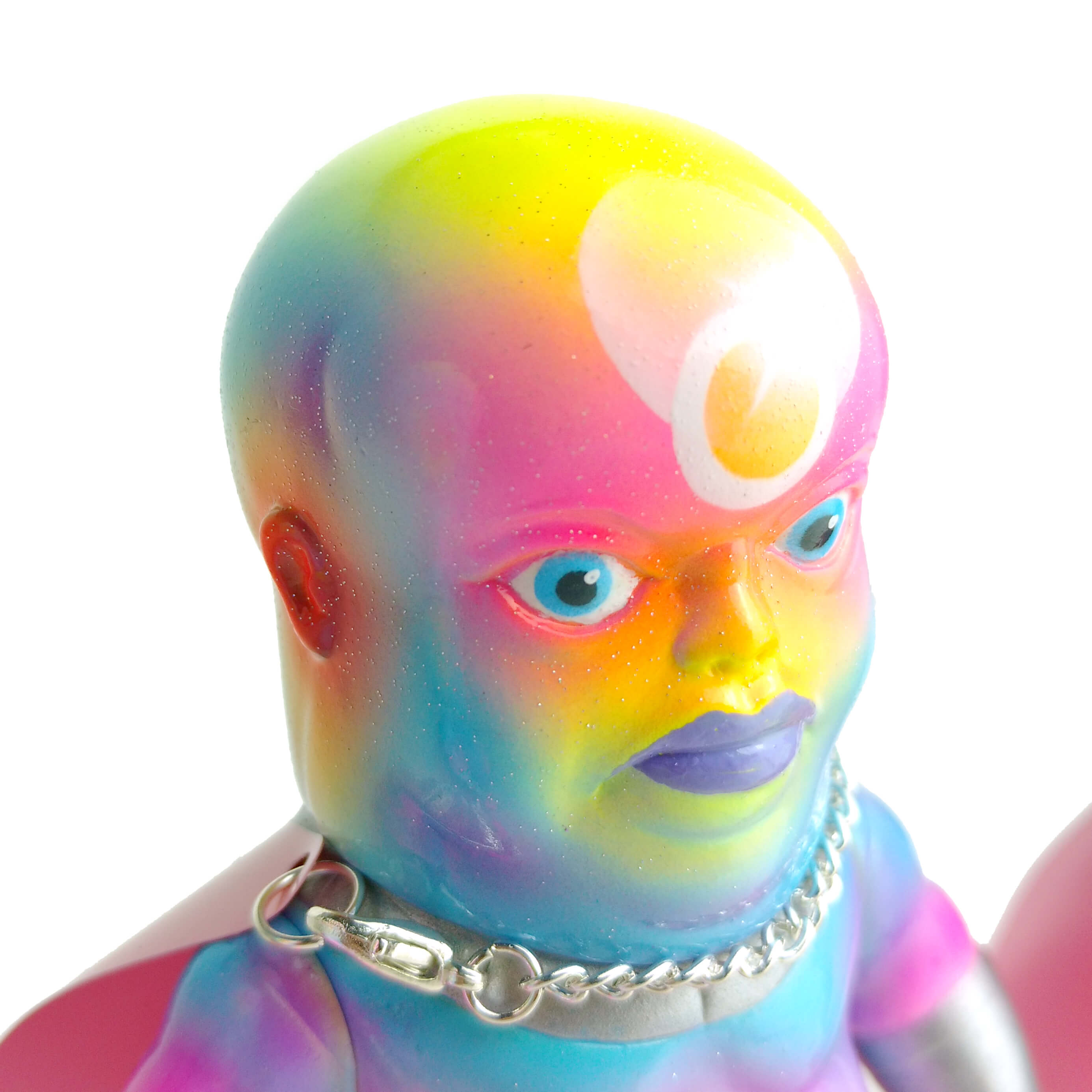 Two of a kind customs featuring hand made cape with lock neck chain. Airbrush painted with UV fluorescent paint, infused micro silver glitter and gloss top coat.