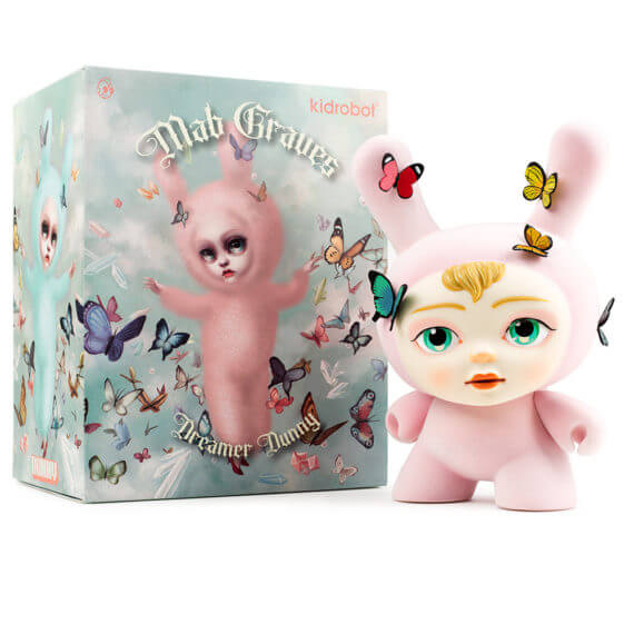Like we said before back in January HERE, dreams do come true! We’ve been big fans of Mab Graves who’s held our hearts with her contemporary Pop-Surrealism art. When Kidrobot leaked 2D vector images of her upcoming 8″ Dunny with Kidrobot we spat out our coffee. We really didn’t see this one coming as Mab’s signature style transitioning into a form of a Dunny that was seen at Clutter’s DTA Dunny show 2 and based off of Mab’s design for this production Dreamer Dunny. Like we said we only had the vector art and couldn’t judge back in January but yesterday images of the somewhat finished version have emerged from retailers.