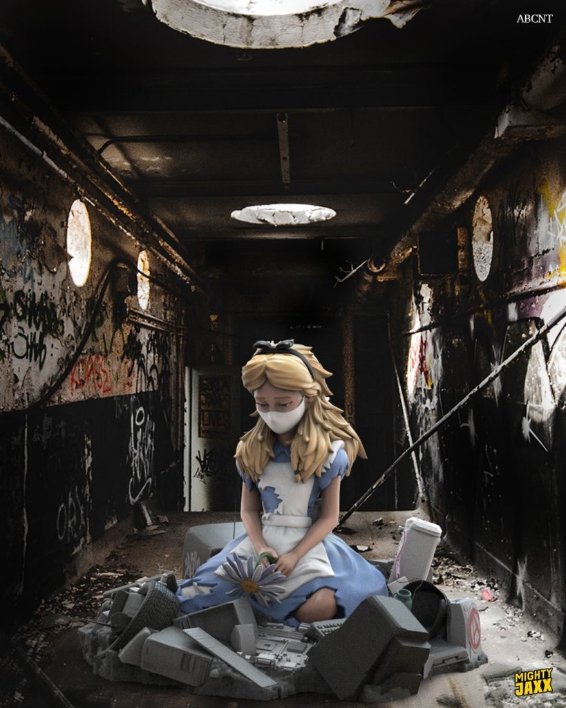 Pass us a hanky, we need to wipe our tears and probably Alice’s tears too! This weekend sees L.A based artist ABCNT link up with Mighty Jaxx once again to present to you “Alice In Wasteland” resin designer toy collectable! You may recall ABCNT’s Bitchy Rich with Jaxx, now ABCNT takes on Alice. Look deeper you can see a clear message in ABCNT art and Alice In Wasteland. It’s going to be great to see it being transformed from 2D into 3D platform.