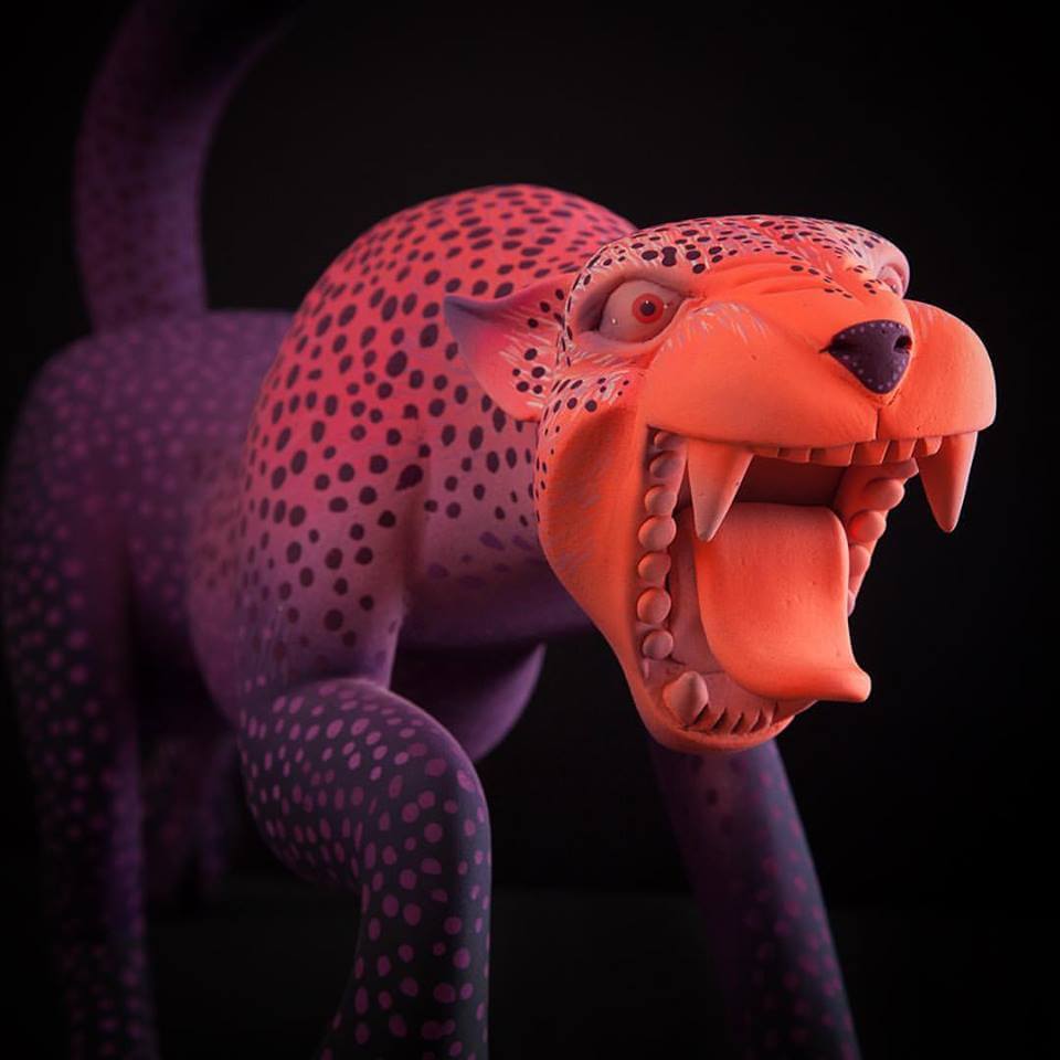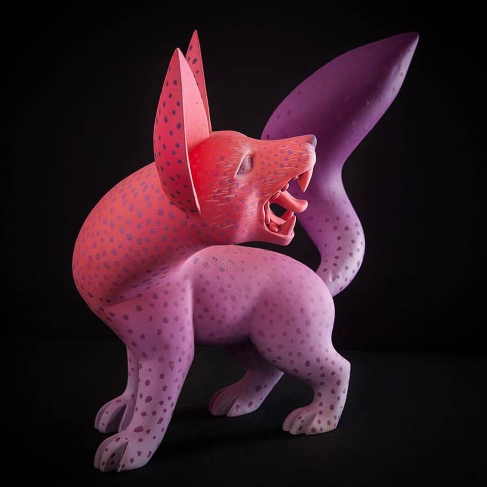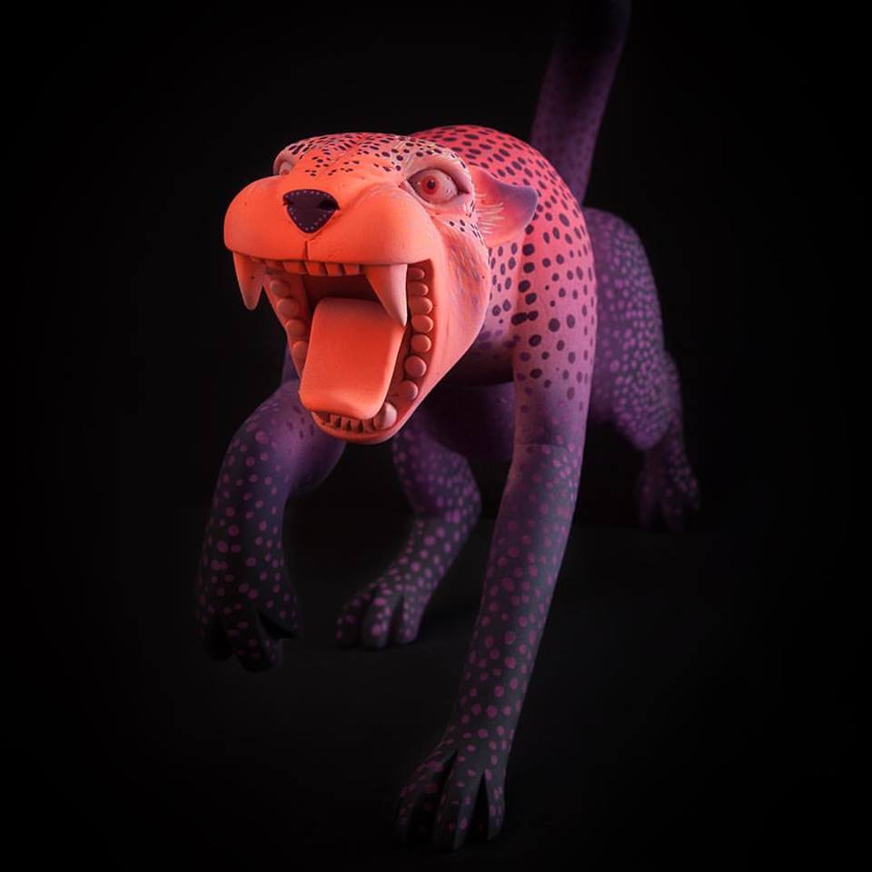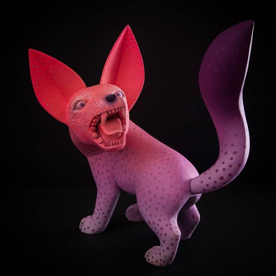 Match made in heaven when Susano M & Mitote join forces to come out with the Arte en Madera series. Wooden sculptures with wildlife involved, the craftsmanship at its best and great to see Mitotes signature style adopted for this series. His forte with a vibrant contrasting blend of colours with wacky expressions got our jaws all the way to the ground once more. With Susano Morales Ramirez carving skills these are to die for especially the jaguar lord know how long each piece took. More of a reason why we featured Mr Mitote as one of the first The Toy Chronicle “Artist Spotlight” features.