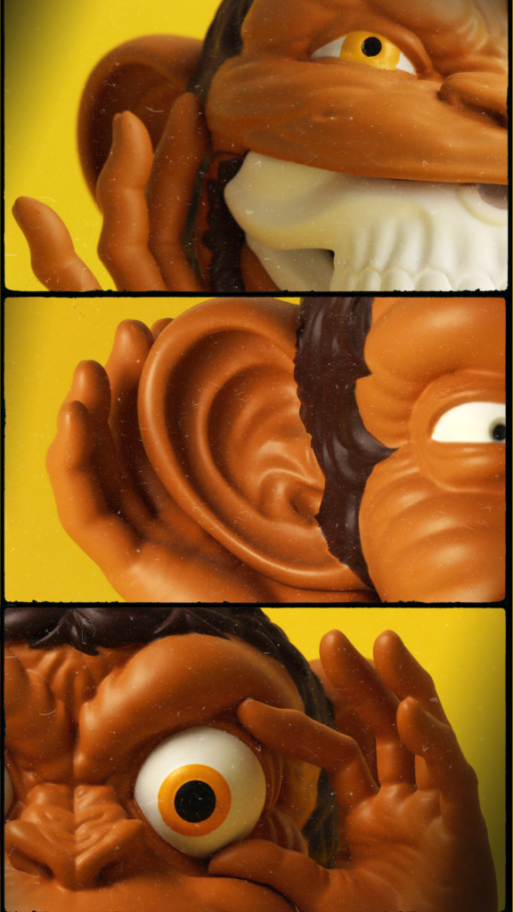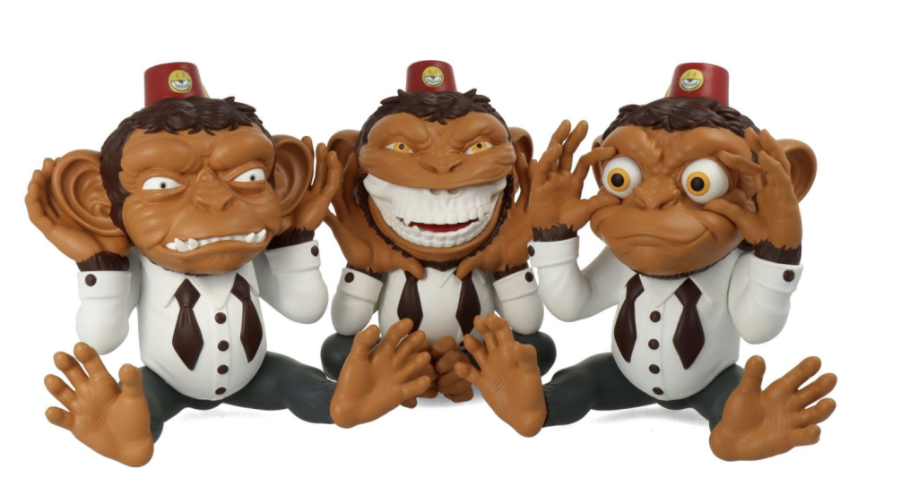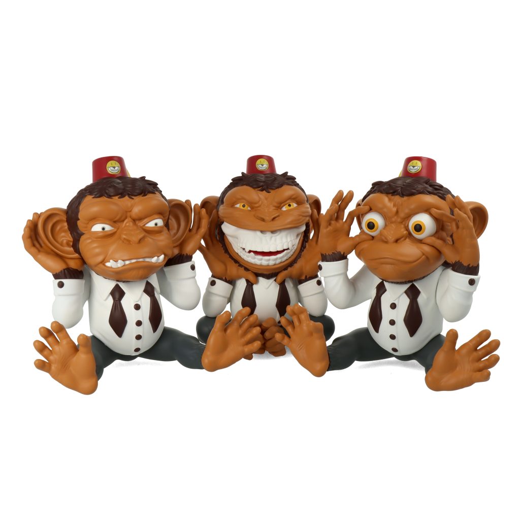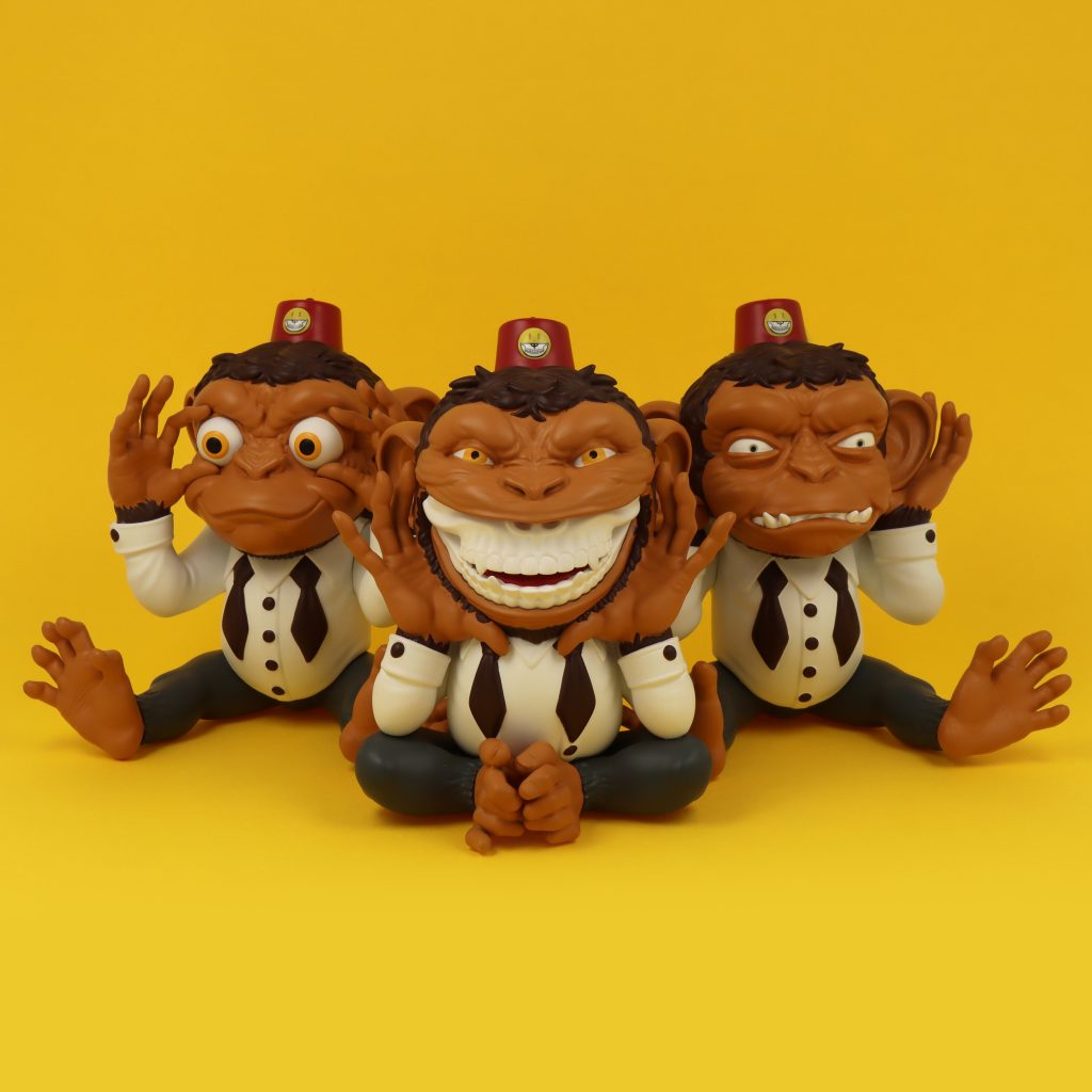 Legendary brand and store artoyz Golem bran unite with Ron English to present to you “More Evil Monkeys! This set of 3 figurines takes the opposite view of these 3 symbolic monkeys which in this case do not seek to block their senses but are determined to show that they are on the lookout. As you will have understood, these figurines are a sharp criticism of today’s world and of the derivatives of social networks and the abuses that result from it: users who want to see everything, hear everything, and above all say everything.