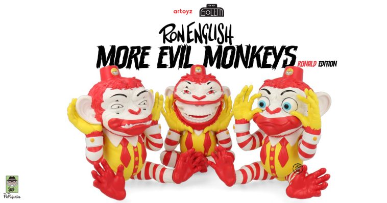A couple of weeks back, Legendary brand and store Artoyz Golem brand united with Ron English to present to you “More Evil Monkeys! The set of 3 figurines takes the opposite view of these 3 symbolic monkeys which in this case do not seek to block their senses but are determined to show that they are on the lookout. As you will have understood, these figurines are a sharp criticism of today’s world and of the derivatives of social networks and the abuses that result from it: users who want to see everything, hear everything, and above all say everything. NOW they have taken on the love of the golden arches with this Ronald edition!