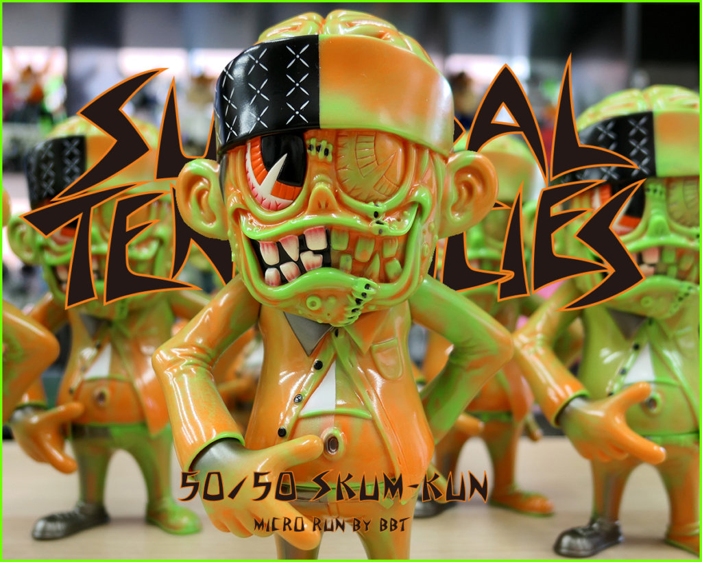 Due to a factory fuck up, where the factory painted the full lot of the S”K”UM-kun Melon Marbled Monster, Blackbook Toy have made a unique version by removing 50% of the factory paint to create a 50/50 S”K”UM-kun. These are limited to only six pieces and are available via lottery system. They are priced at 15000YEN (about £113) each.