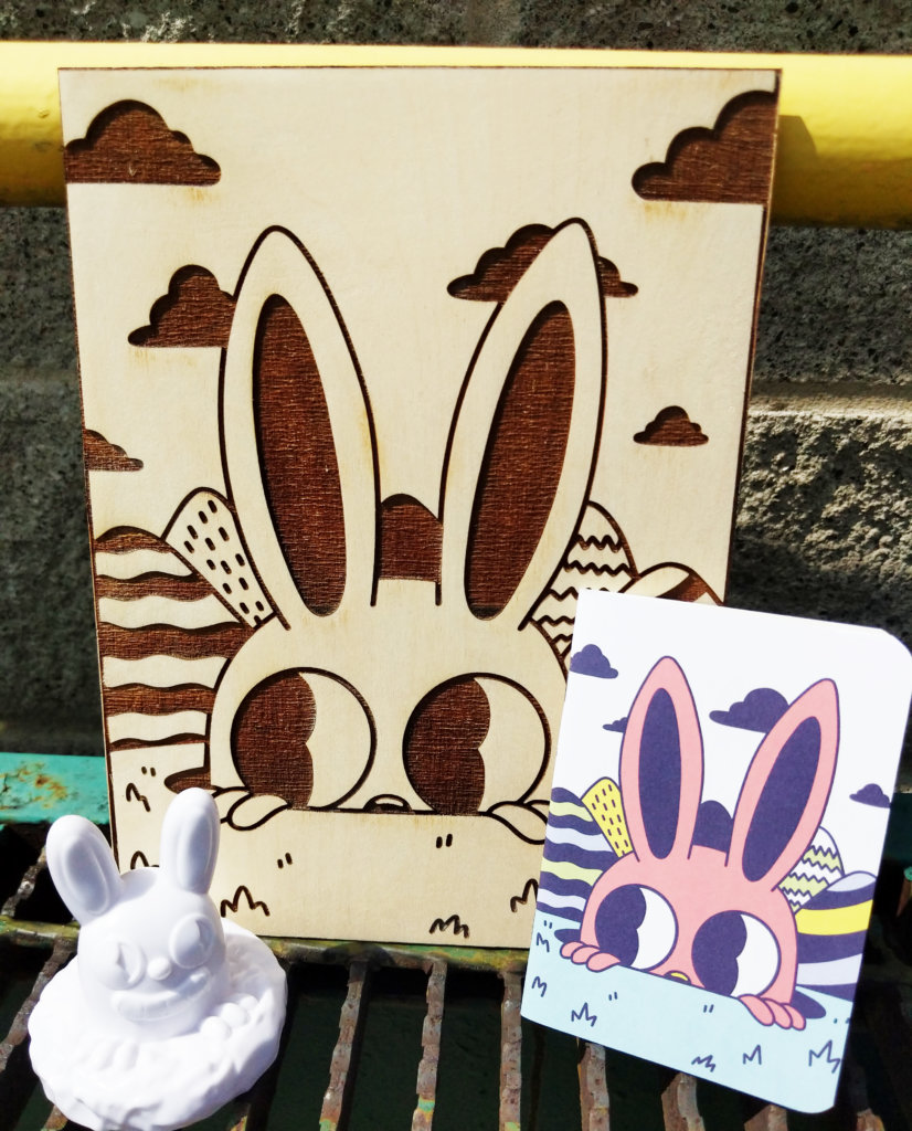 Available NOW at blakejonesart.bigcartel.com the Bunny Boy is available in two colourways – Glossy White and Baby Pink. Both limited to 250 pieces and priced at $15 each (about £12). These stand at 3inches tall and made from soft vinyl. There are extras available such as limited edition matching sketchbooks and laser cut art plaques (as seen below).
