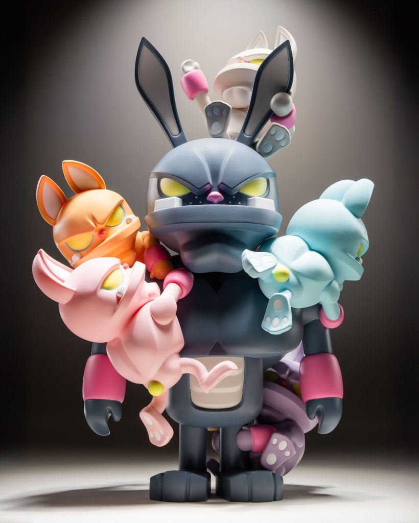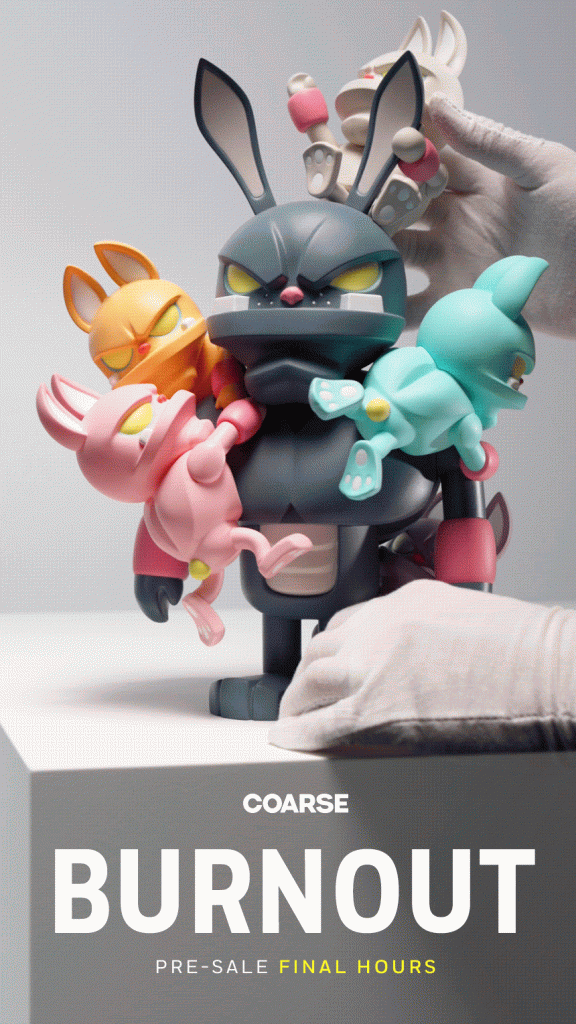 Handcrafted in premium vinyl, Burnout depicts a radiant spectrum of worries circling paw! like a typhoon, draining all the colour out of the towering grey monkeyrabbit. This is a sculpture about being pushed to a breaking point and finding a way to fight through the storm.