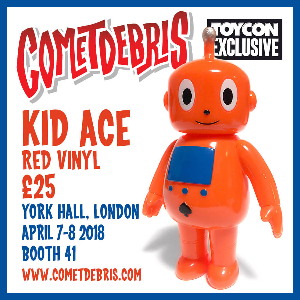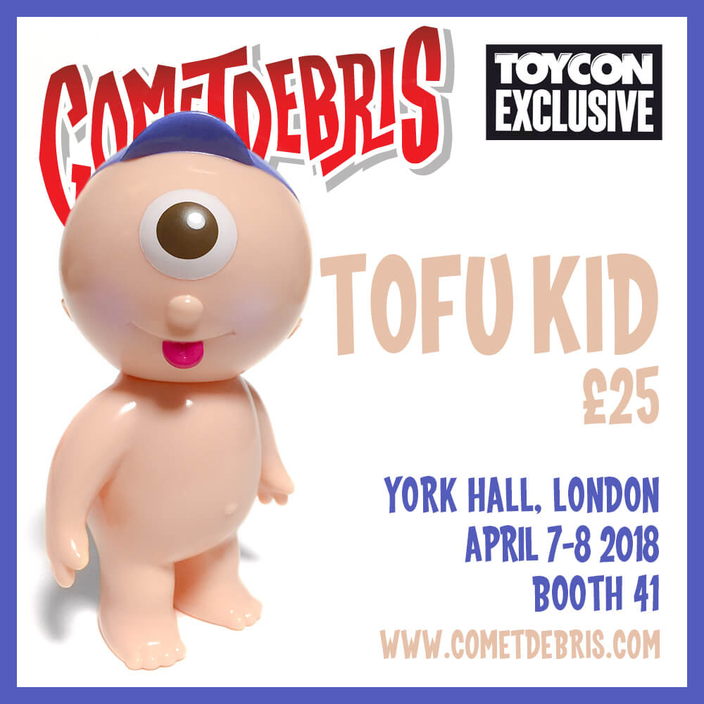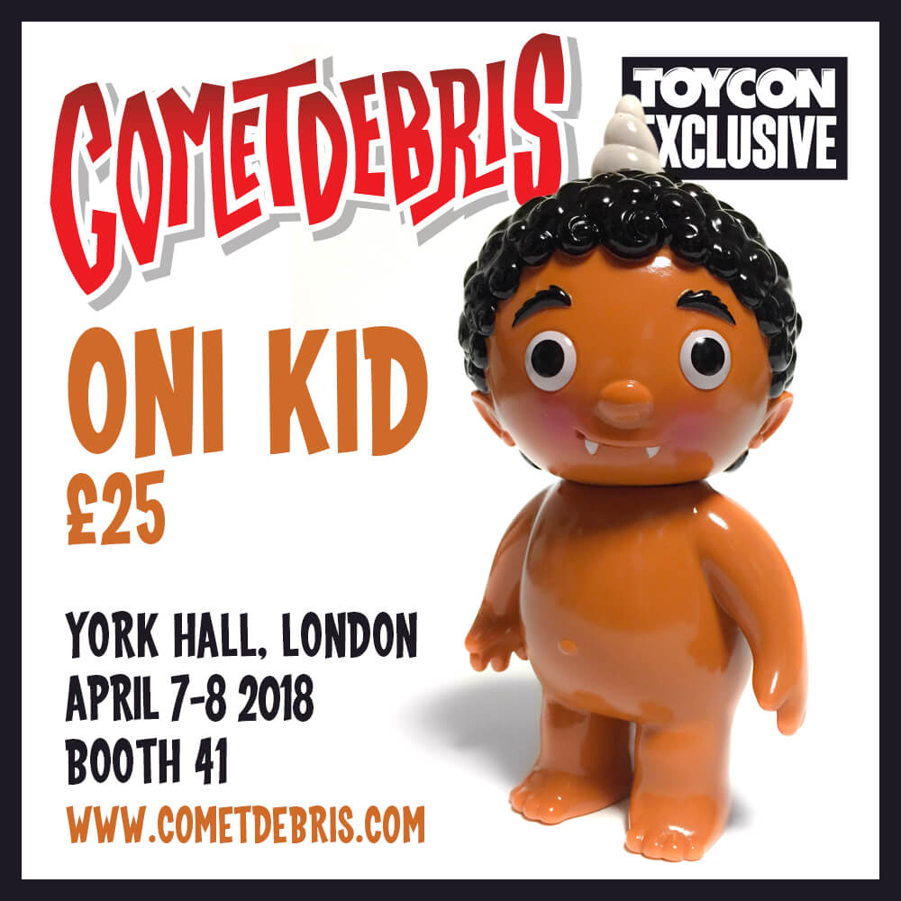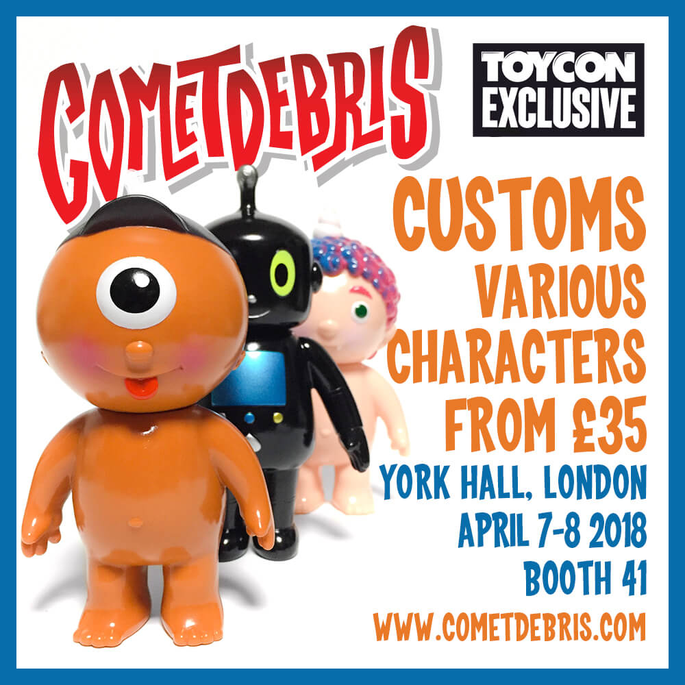 Cometdebris has invaded and set to conquer London once again! 4th year in a row and this WEEKEND Koji Harmon aka Cometdebris has brought along with him a few exclusives all the way from Japan. Expect to see Tofu Kid, Kid Ace, Ace Robo, Kappa Kid our favourite Oni Kid. This year Cometdebris added a little twist for ToyCon UK, by giving you the chance to own some custom pieces too.