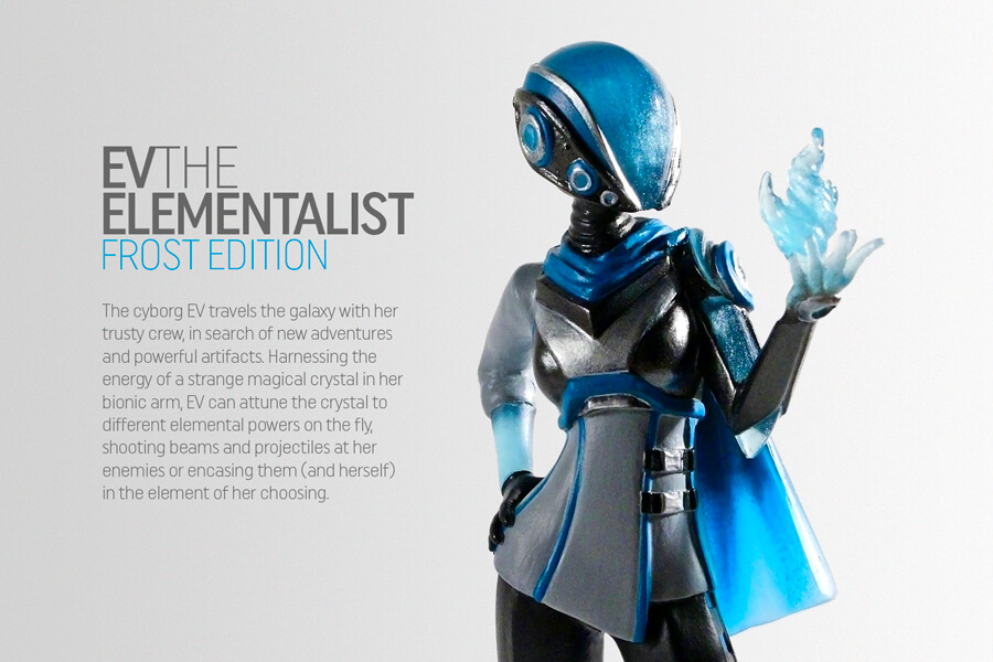 The cyborg EV travels the galaxy with her trusty crew, in search of new adventures and powerful artifacts. Harnessing the energy of a strange magical crystal in her bionic arm, EV can attune the crystal to different elemental powers on the fly, shooting beams and projectiles at her enemies or encasing them (and herself) in the element of her choosing.