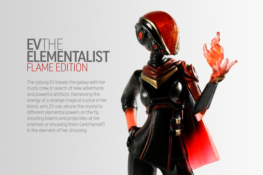 It’s been a long time coming, but its worth the wait in gold! Drumroll, please….. TTC Artist Spotlight Fiona Ng has completed one of her original characters, staying true to her signature style, mixing fantasy and armour “EV the Elementalist” is one sleek resin figure all backed up with a cool backstory. Hopefully, EV the Elementalist will launch a never ending series! It has been a joy to watch all the work in progress shots from Fiona’s Instagram and now EV the Elementalist is ready for YOU.