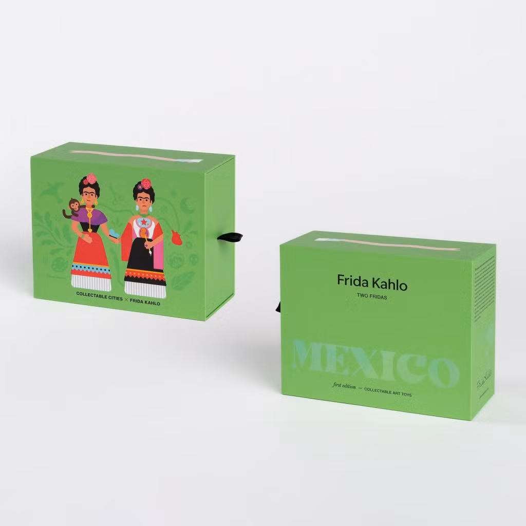 Each stands 10.4cm tall, and when placed together they align to hold hands. Limited first edition run of 3000ea, 1500 of which come in the ‘Two Fridas’ collector box set, all with hand-numbered cards.