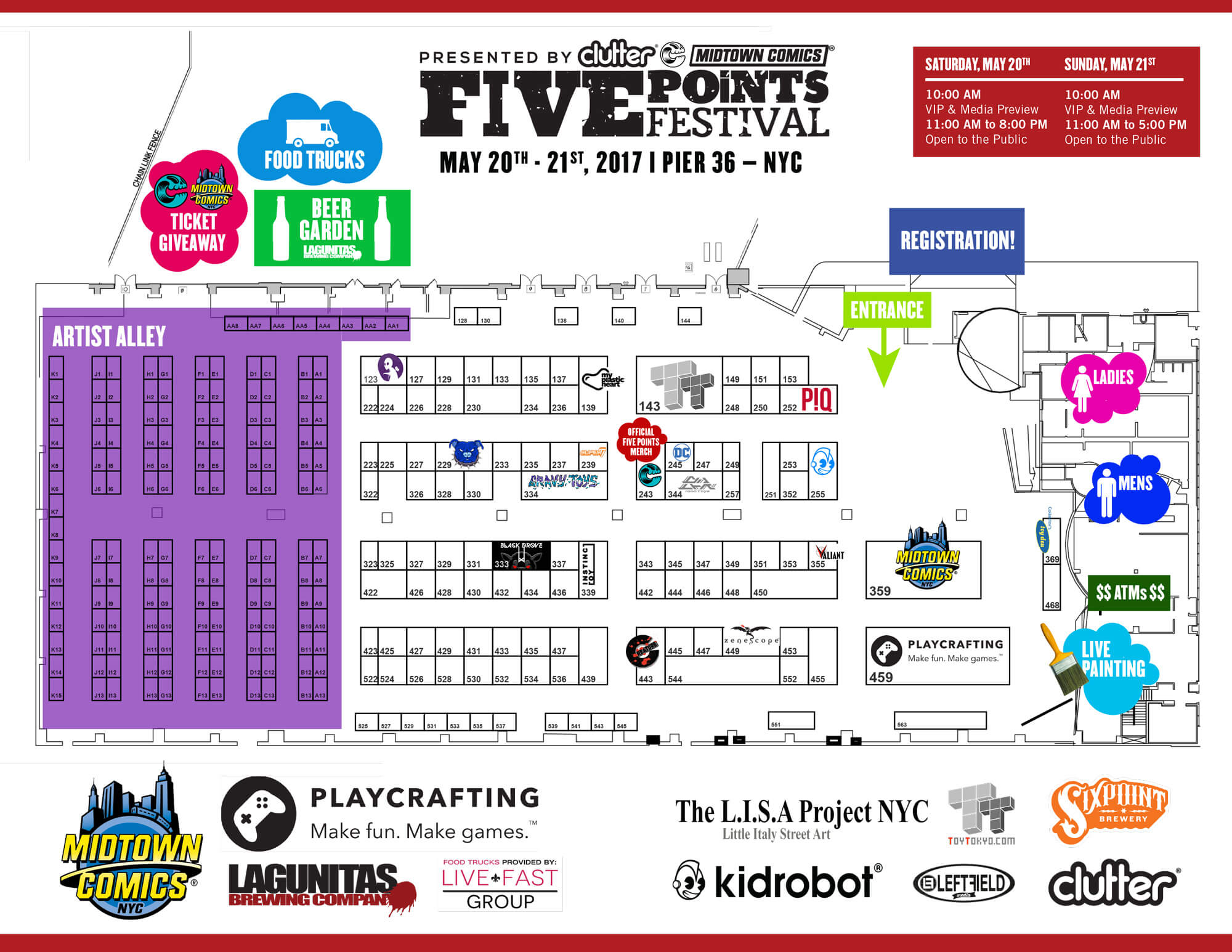 With less than FIVE days to go till Five Points Festival, the guys at Clutter Magazine & Midtown Comics have released the Exhibitor & Artist Alley map, so now you can plan your route to visit your favourite artists. Boy, have they gone BIG! Huge in fact! For their first year, they’ve gone ballsy, and we love it. We’re heading over to NYC this week to take in the Five Points Fest experience. It looks like we’ve got a lot of things to take in over the course of 20th & 21st May! We’ll be bringing you LIVE stream via our Facebook Page HERE. Go give us a Like, if you haven’t already.