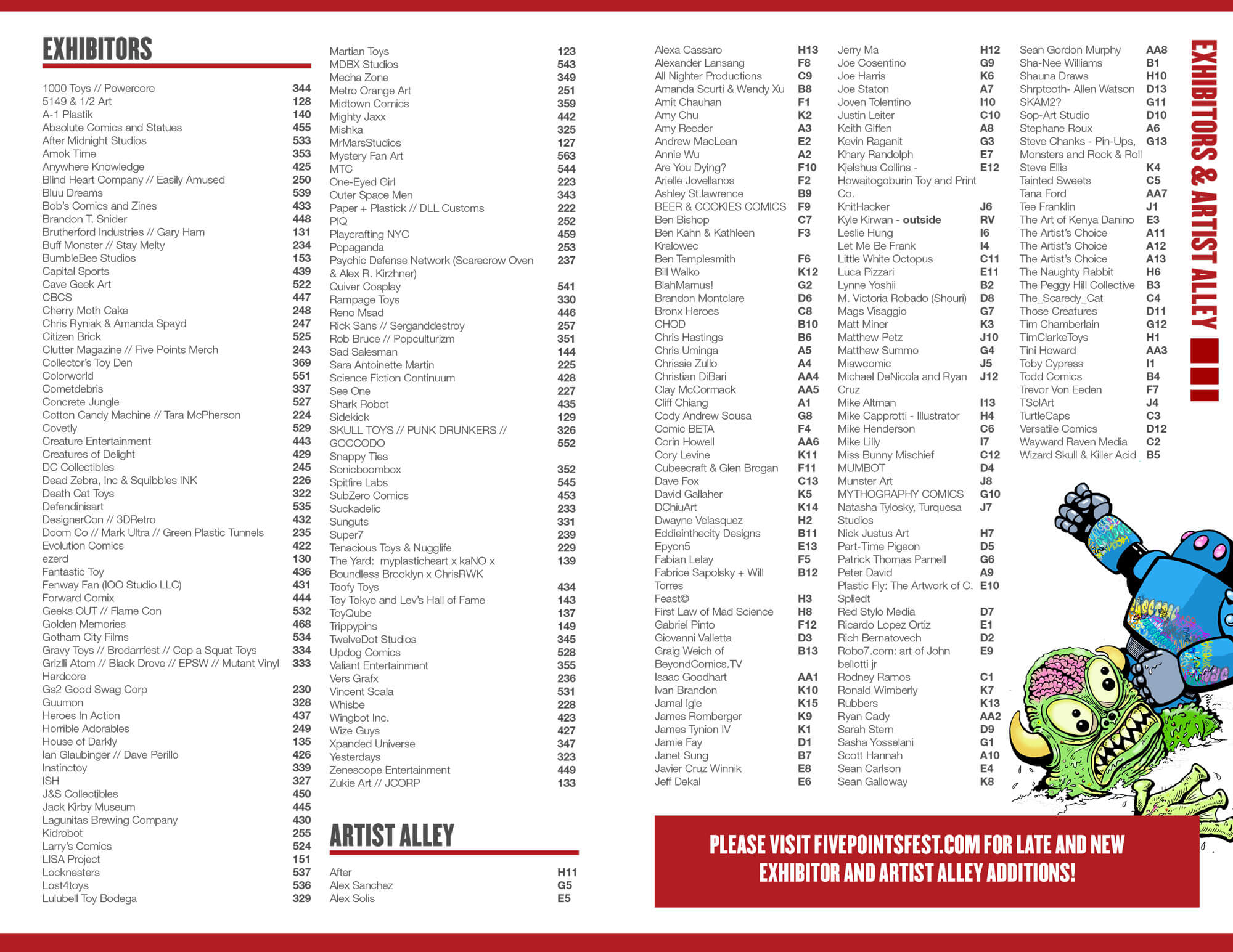 You obviously want to know what each number correlates to, right? Well, we have you covered. Below you will find the Exhibitor and Artist numbers for each booth at Five Points…
