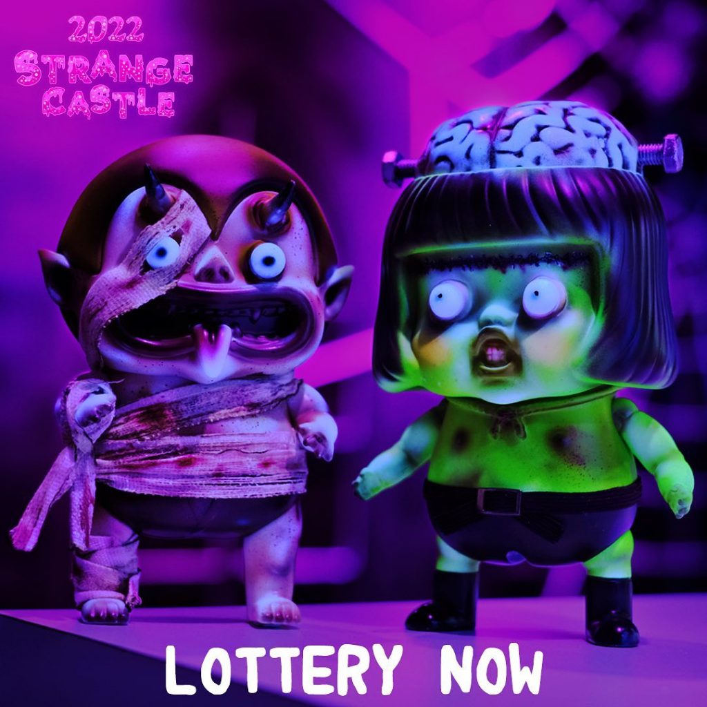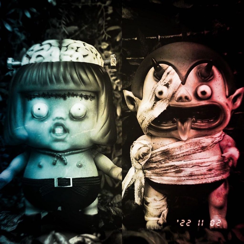 Halloween is not over until Strange Gallery says so! Fresh out of their recent “Strange Castle” glow in the dark show DOLL Q & DEVIL D are ready to haunt another castle or home! The special collaboration between FOK QUEENIE and Octoplus Gallery features the two beloved characters painted with special UV reactive paints and full on glow in the dark action.