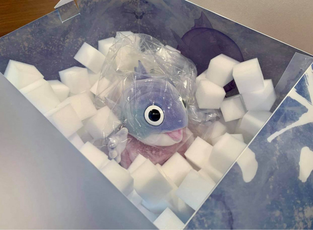 We will first explain the packing condition. As highlighted above the product has a delicate layer of transparent flocking on the whole body. We considered that if a blister shell was used during packing it may adversely affect the flocking on the contact points of the main body, due to vibration during transportation and shipping. Therefore, we manufactured a special cube-shaped packing material to cushion the figure inside the packaging box. When removing the figure from the box, please lift it carefully so as not the scratch the main body.” A set of two ICE LIQUID, which is separate parts, are included inside the package. Please look for them in the packaging materials. – Instinctoy.