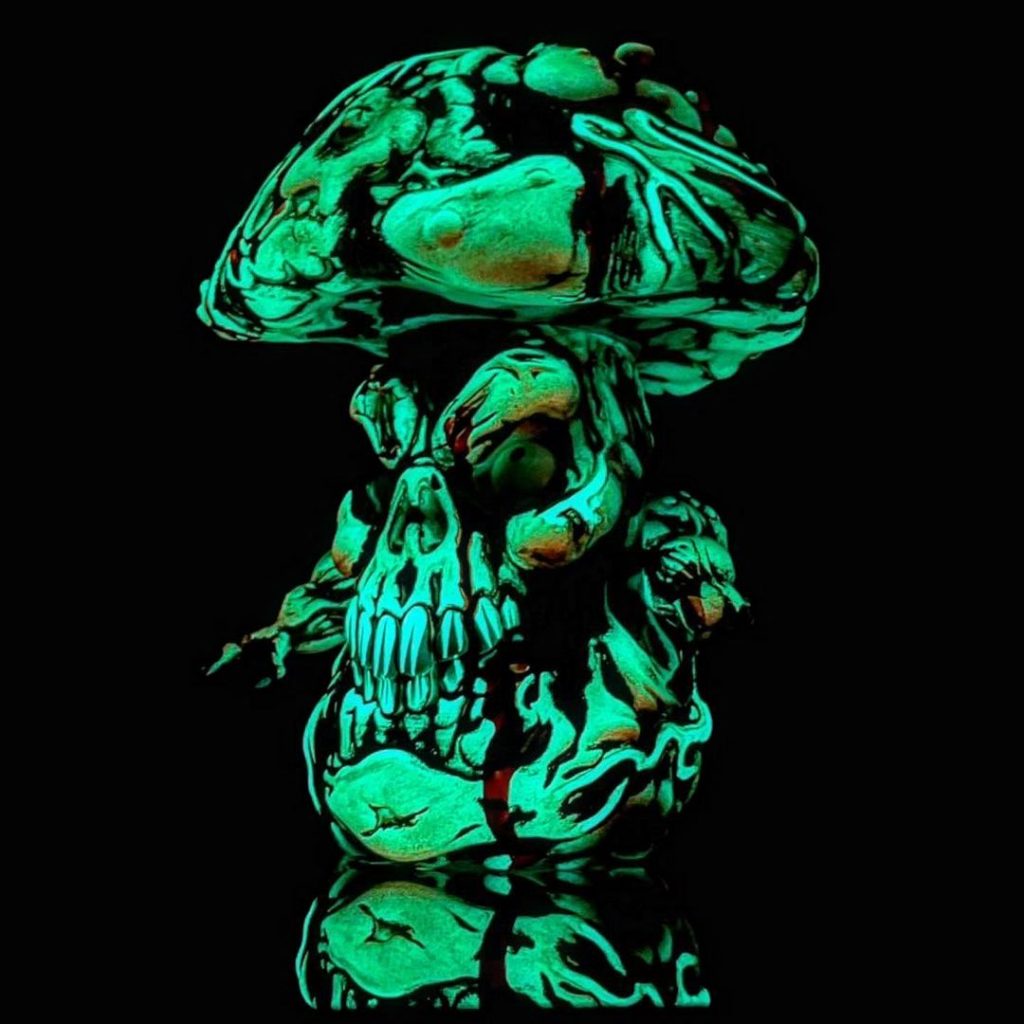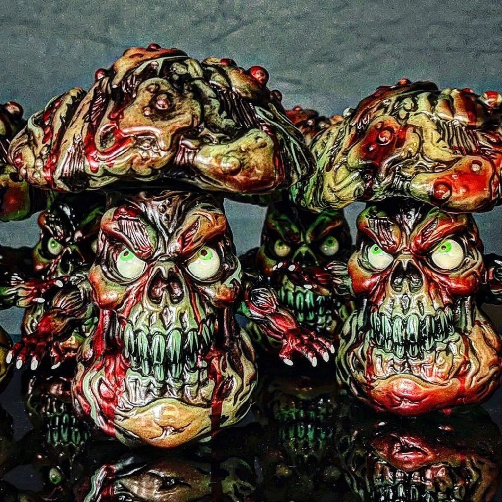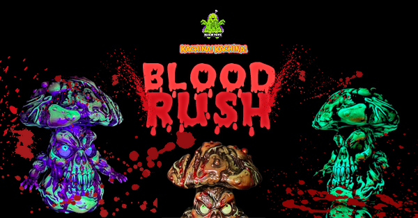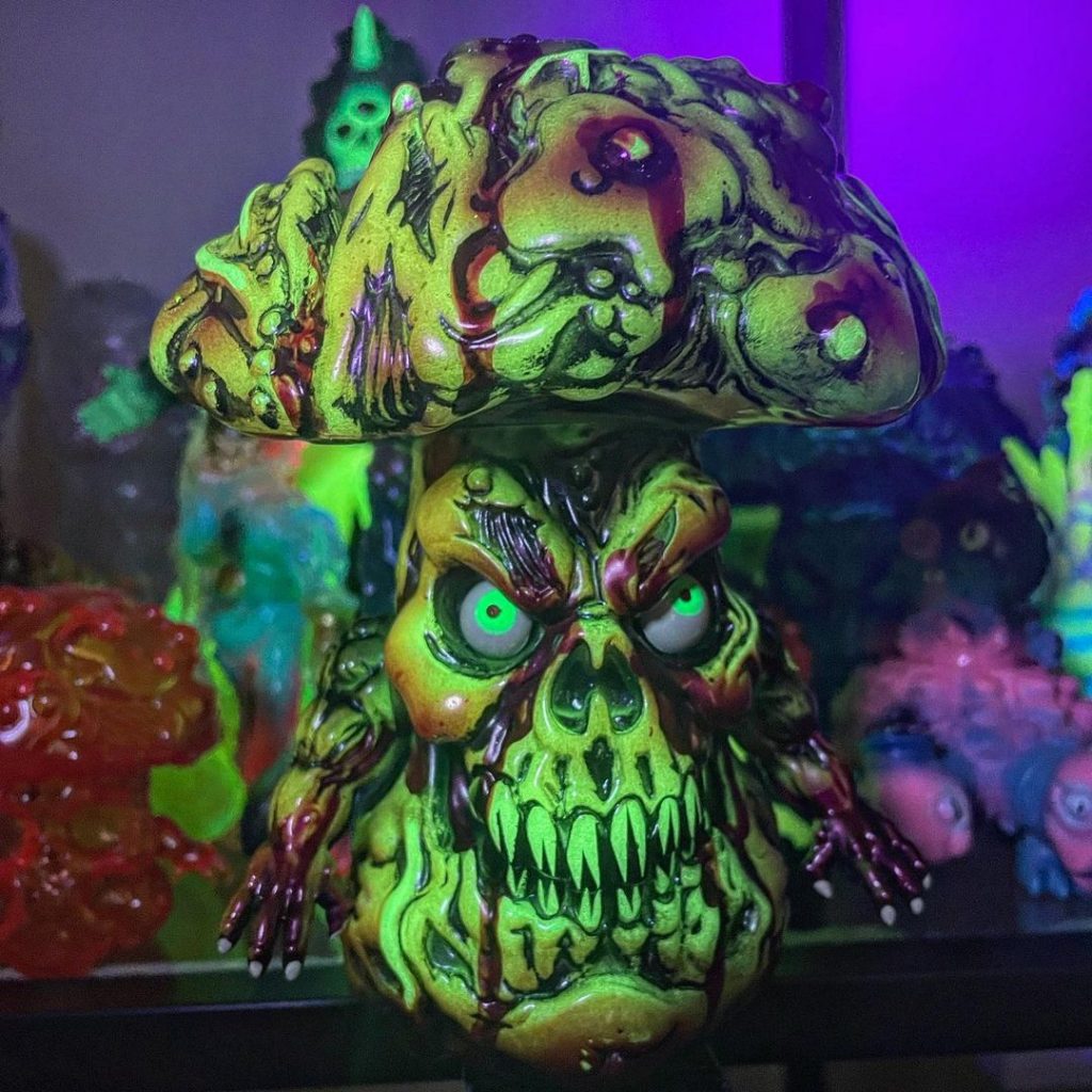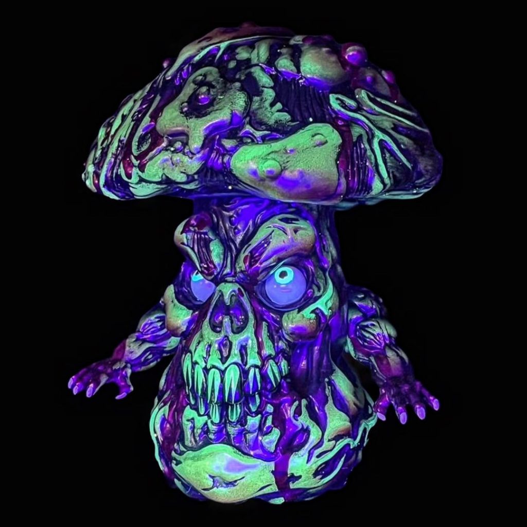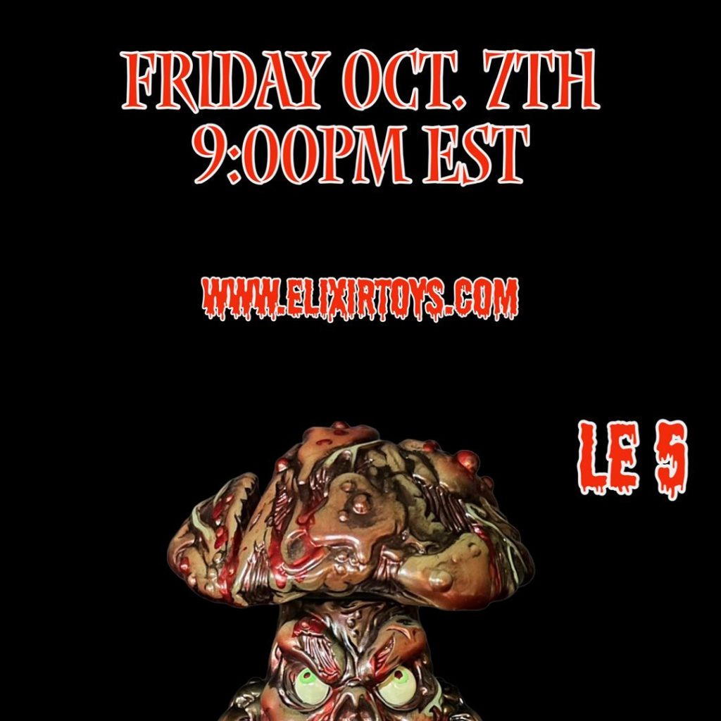 It’s the spooky season. How better way to kick off celebrations than with sofubi? Our favorite fungus is back in one bloody amazing limited edition, the vile and putrid creature who stalks swamps and bogs all over the world appears covered in blood on top of that amazing glow in the dark soft vinyl cast Elixir Toys got us used to. The impressive paint job is done by the one and only Portland Oregon based artist Kachina Kachina.