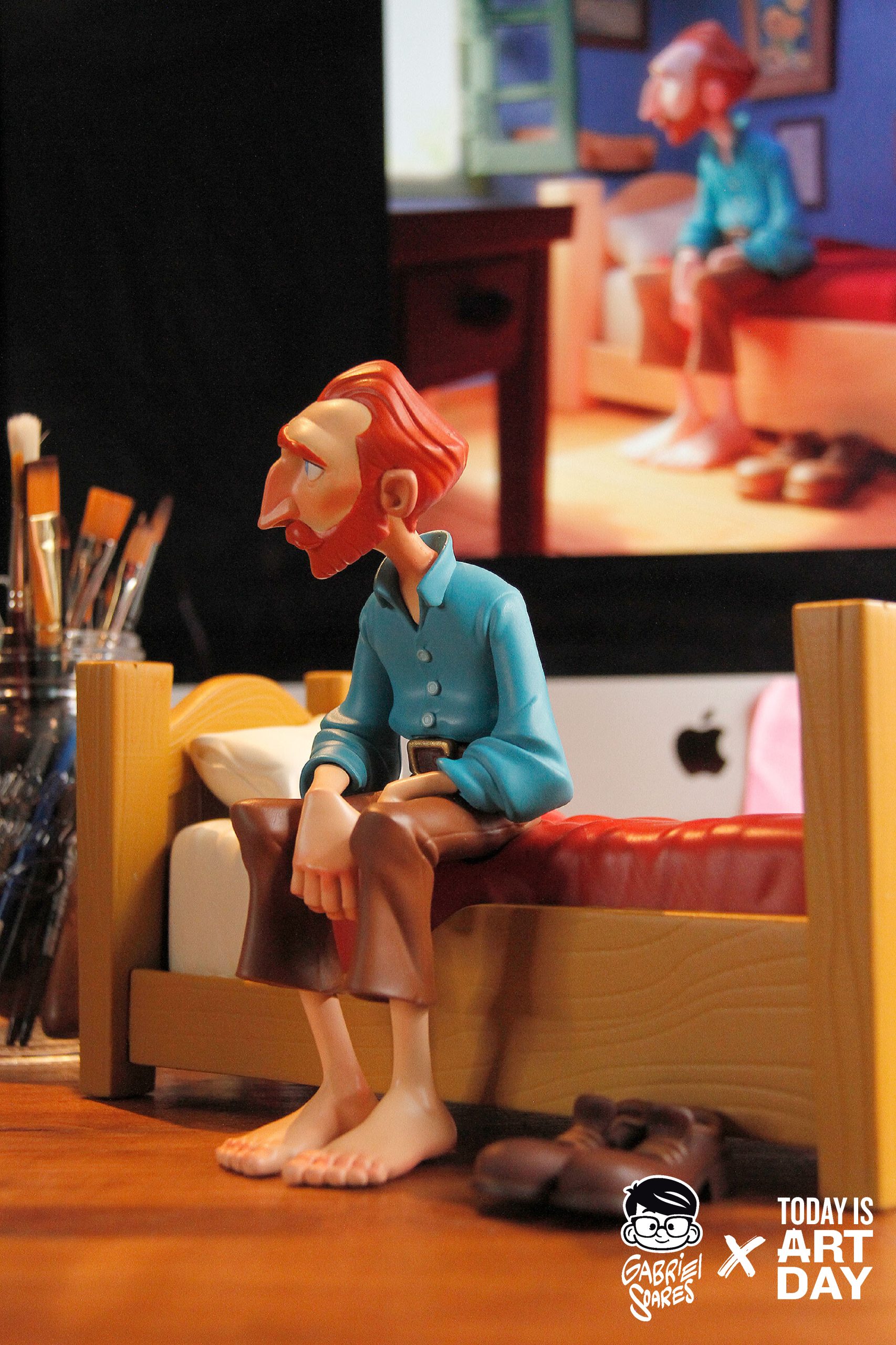 Inspired by the Dutch Post-Impressionist artist and his famous Bedroom in Arles series of paintings, the vinyl collectible features the artist gazing out his window, sitting on his bed after a long day of work with his shoes by his bedside.