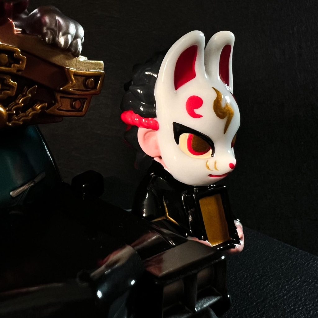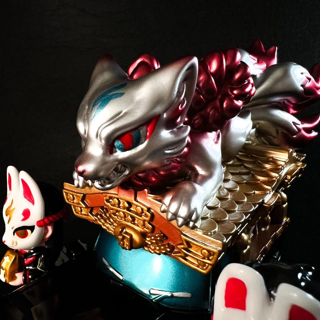 A silver fox ventures through the forest, its head crowned with a blue flame. In the darkness, a golden palace glides silently, accompanied by a procession of yokai and foxes.
