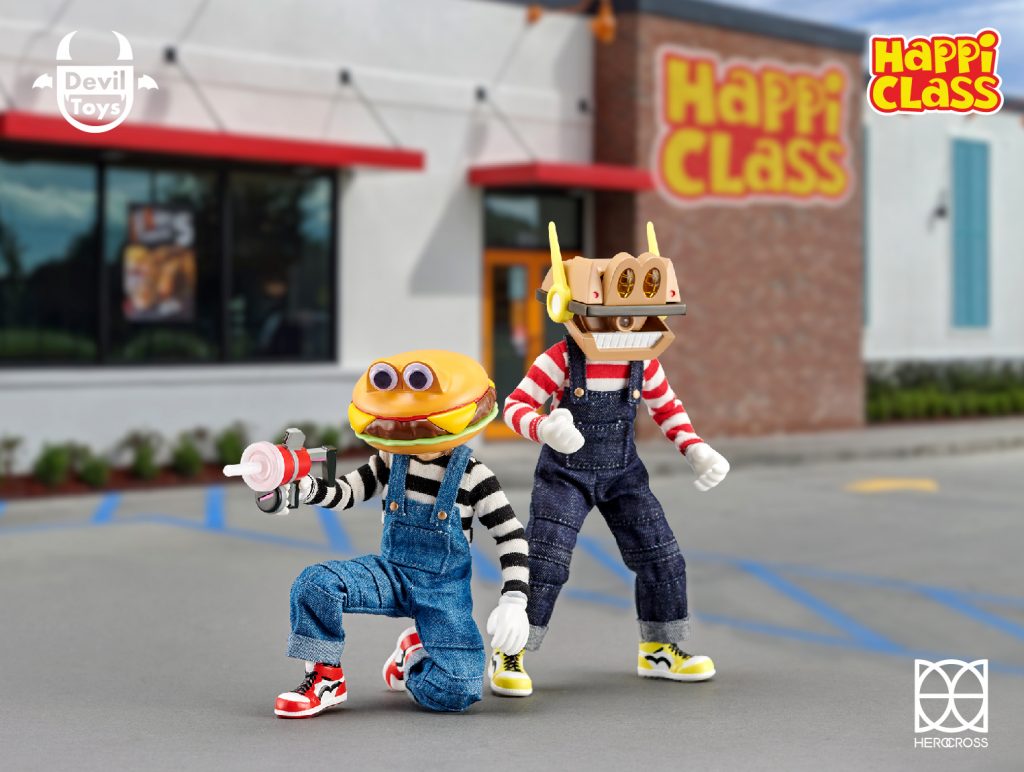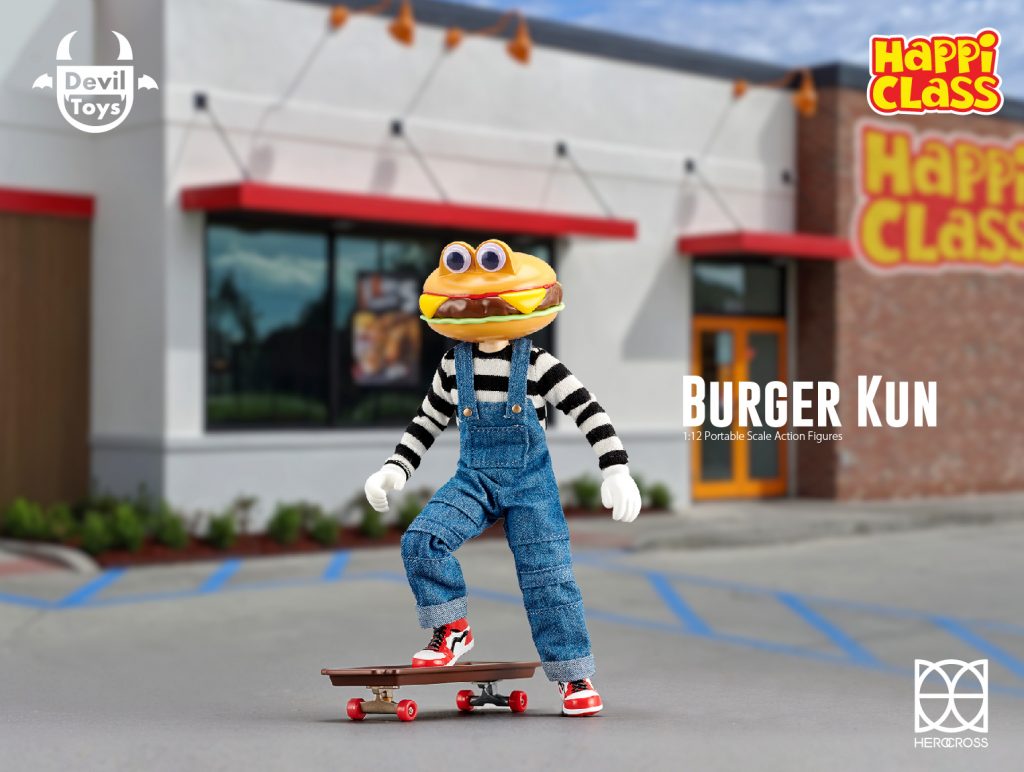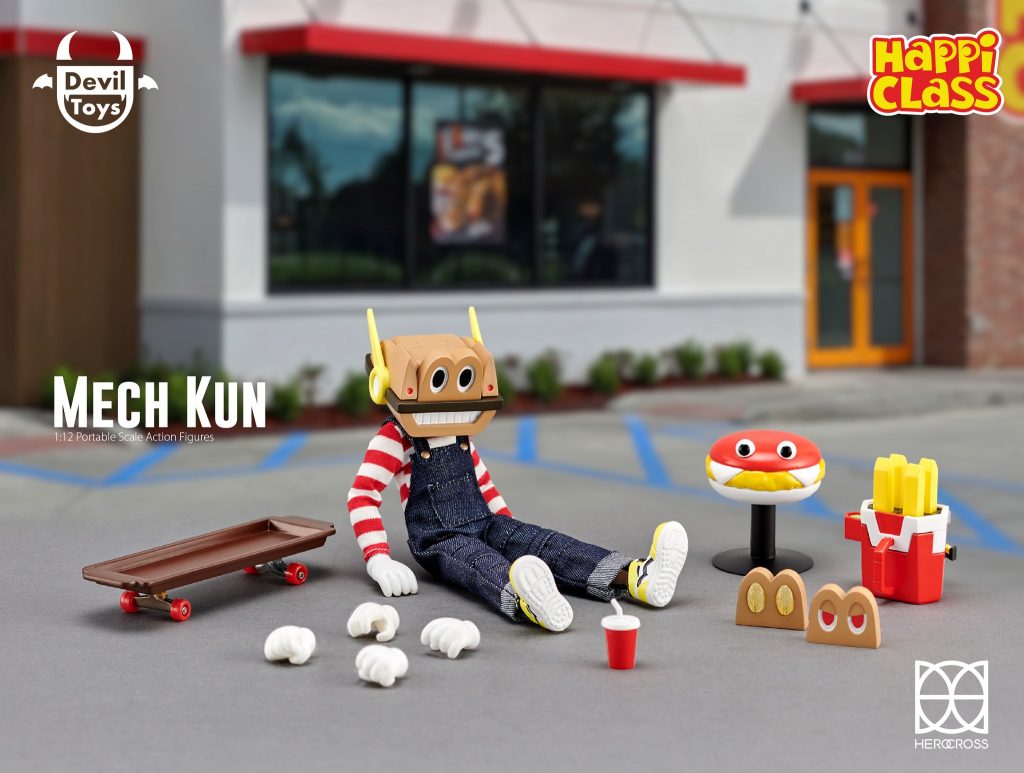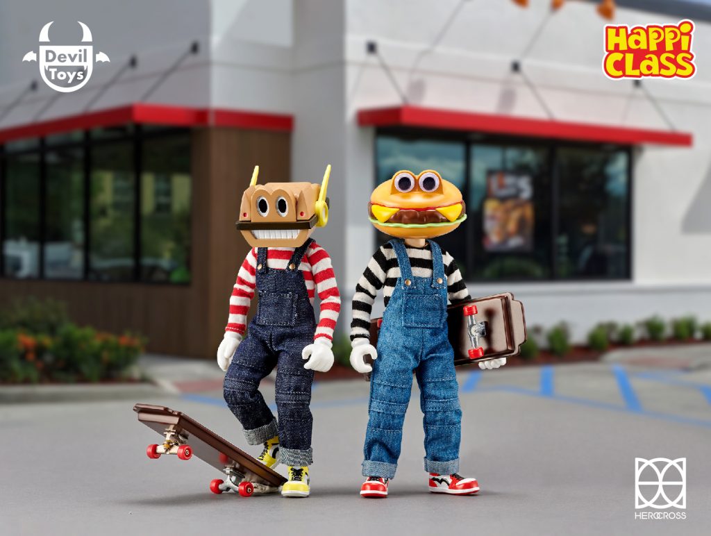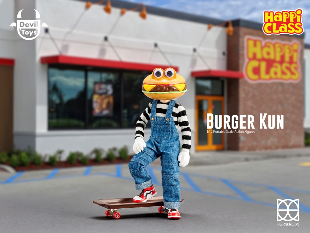 The debut BURGER KUN and MECH KUN are equipped with finely handcrafted cloth uniforms, newly designed weapons, and skateboards. The theme is inspired by fast food culture. The debut MECH KUN is equipped with three sets of replaceable eyes and a mouth that can be opened and closed. As an additional selling point, BURGER KUN comes with a miniature version of candy toy to play with. HAPPICLASS x Devil Toys are paying tribute to the small toys that were included for everyone who ate fast food meals when they were young.