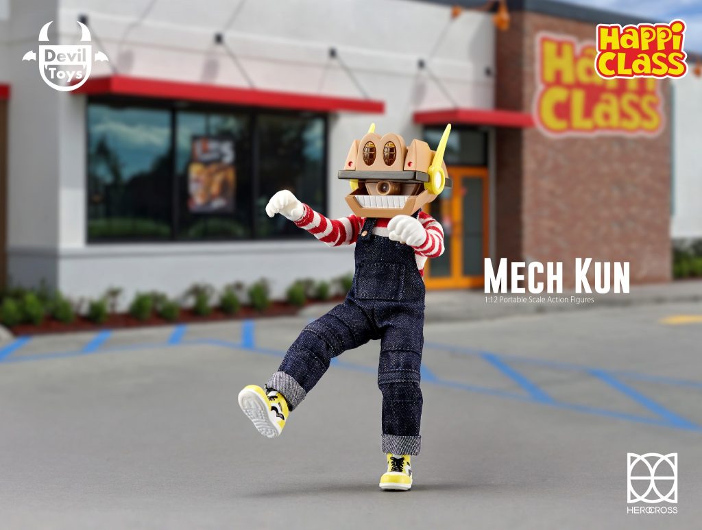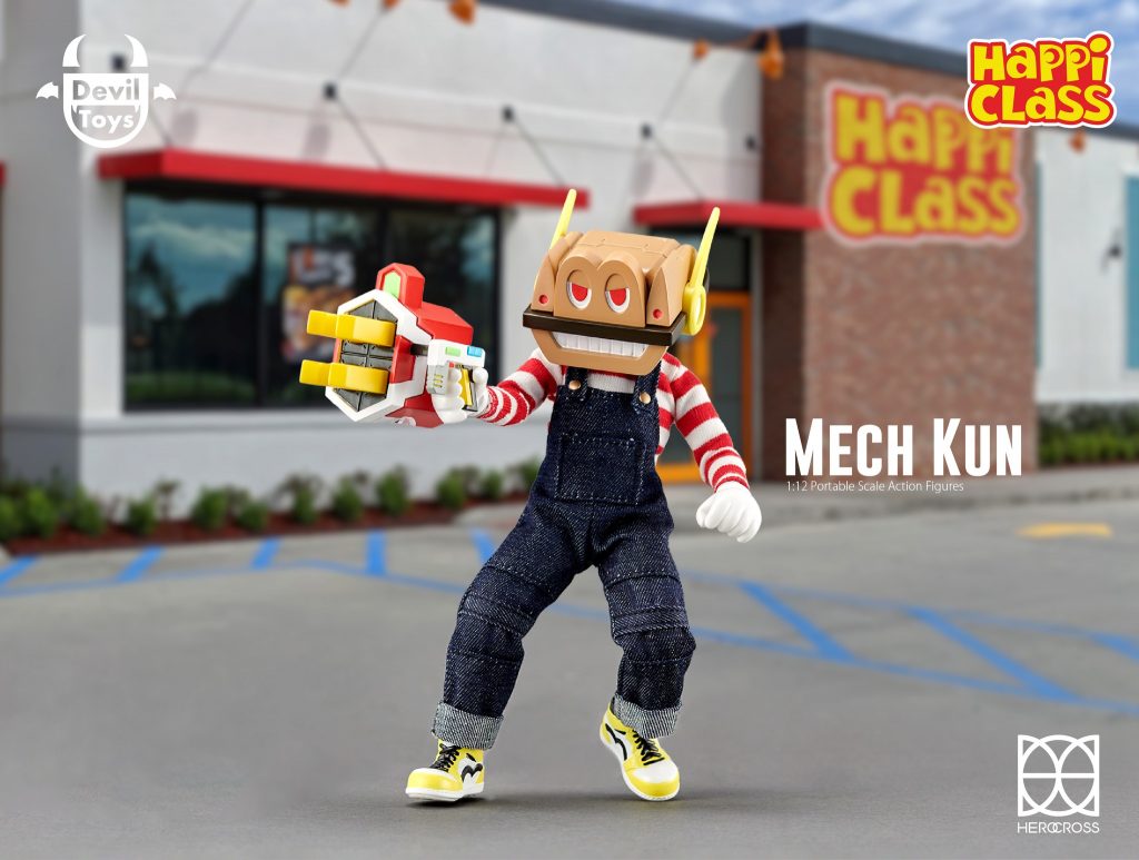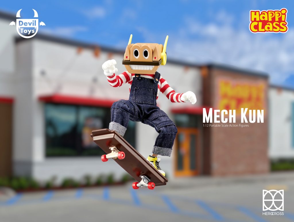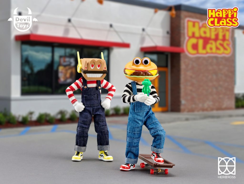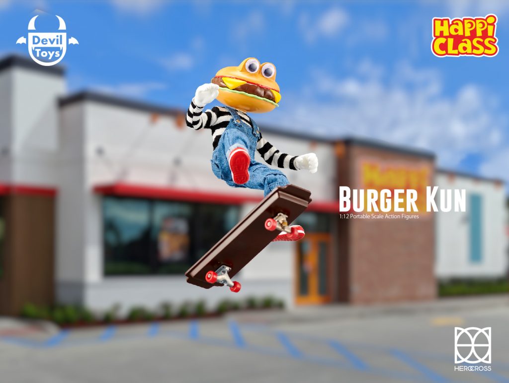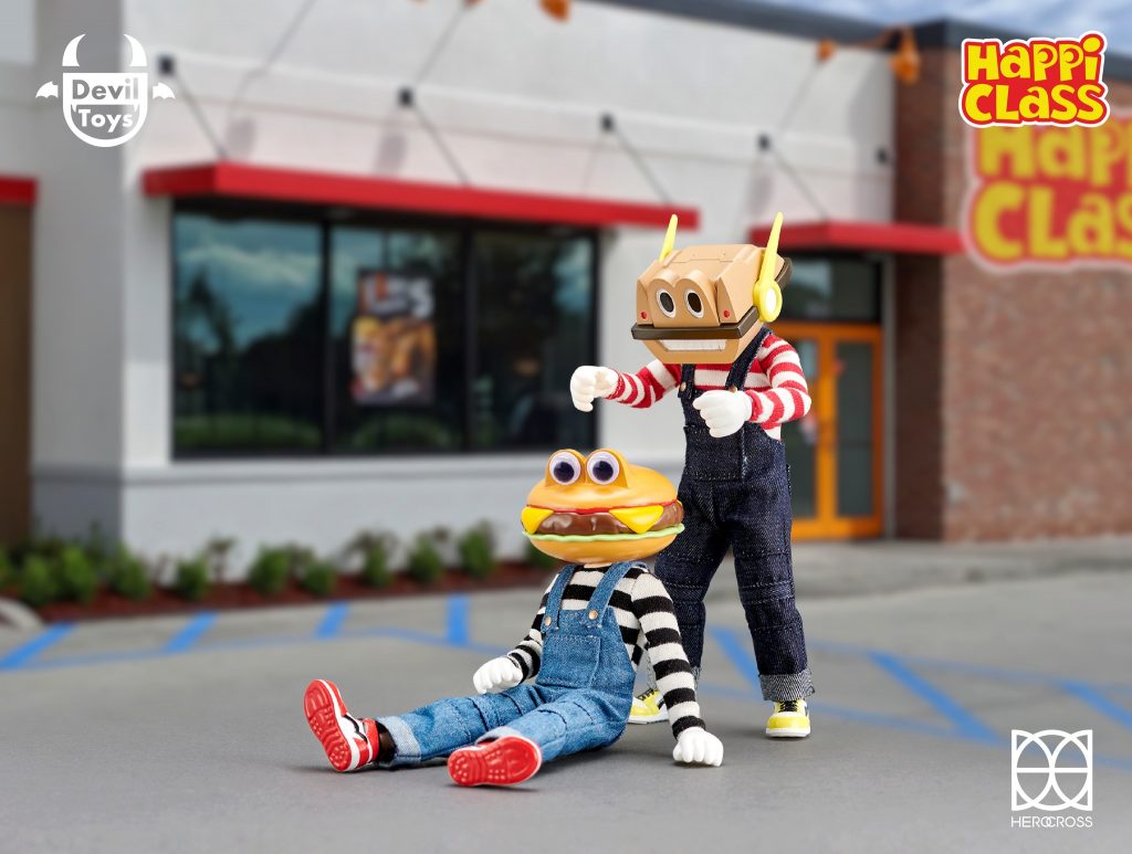 The debut BURGER KUN and MECH KUN are equipped with finely handcrafted cloth uniforms, newly designed weapons, and skateboards. The theme is inspired by fast food culture. The debut MECH KUN is equipped with three sets of replaceable eyes and a mouth that can be opened and closed. As an additional selling point, BURGER KUN comes with a miniature version of candy toy to play with. HAPPICLASS x Devil Toys are paying tribute to the small toys that were included for everyone who ate fast food meals when they were young.