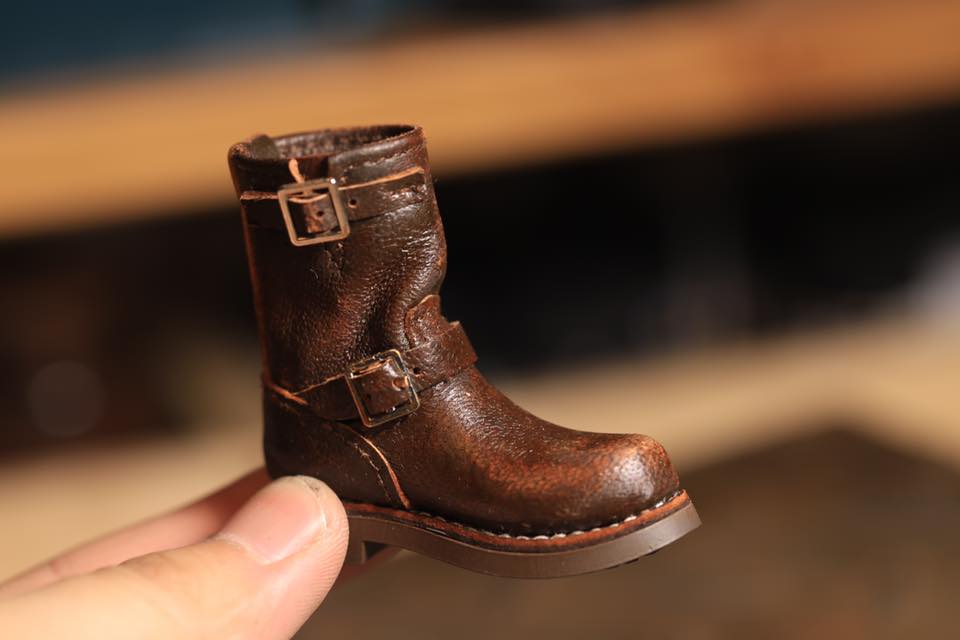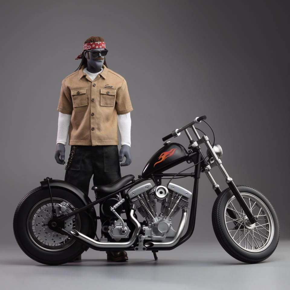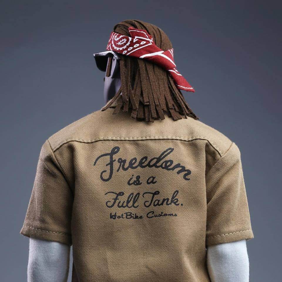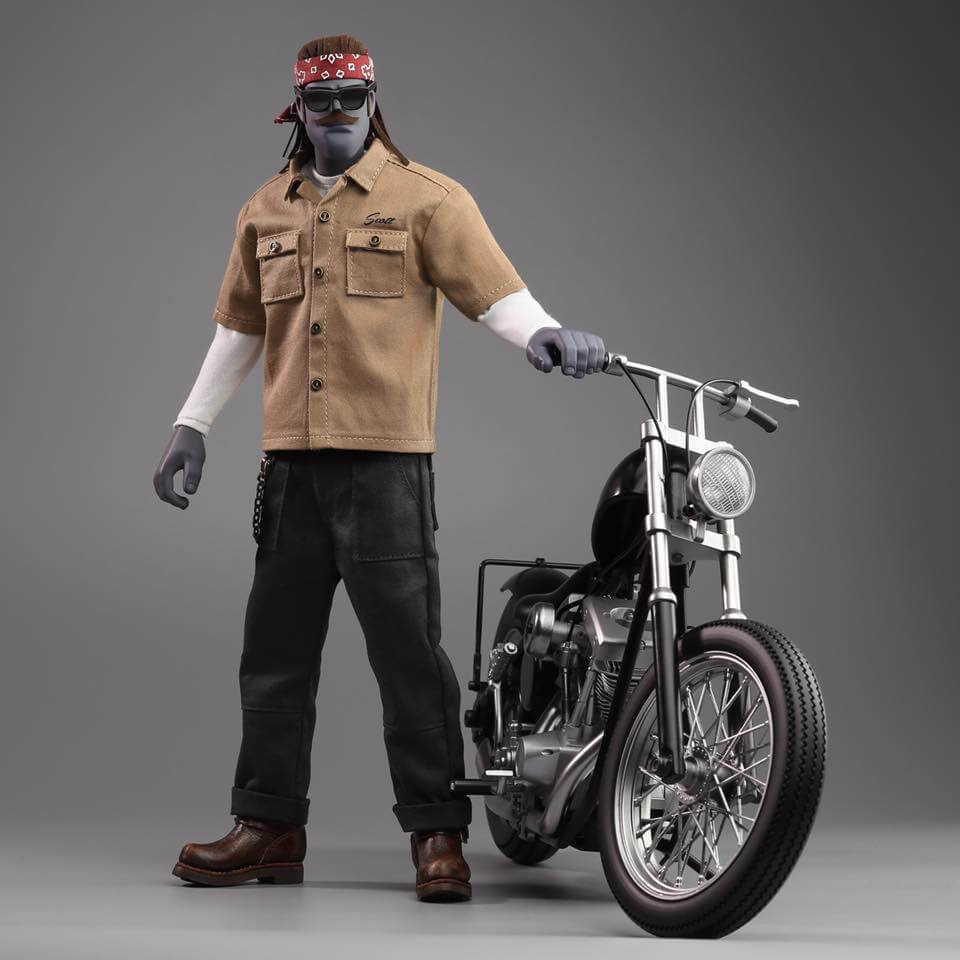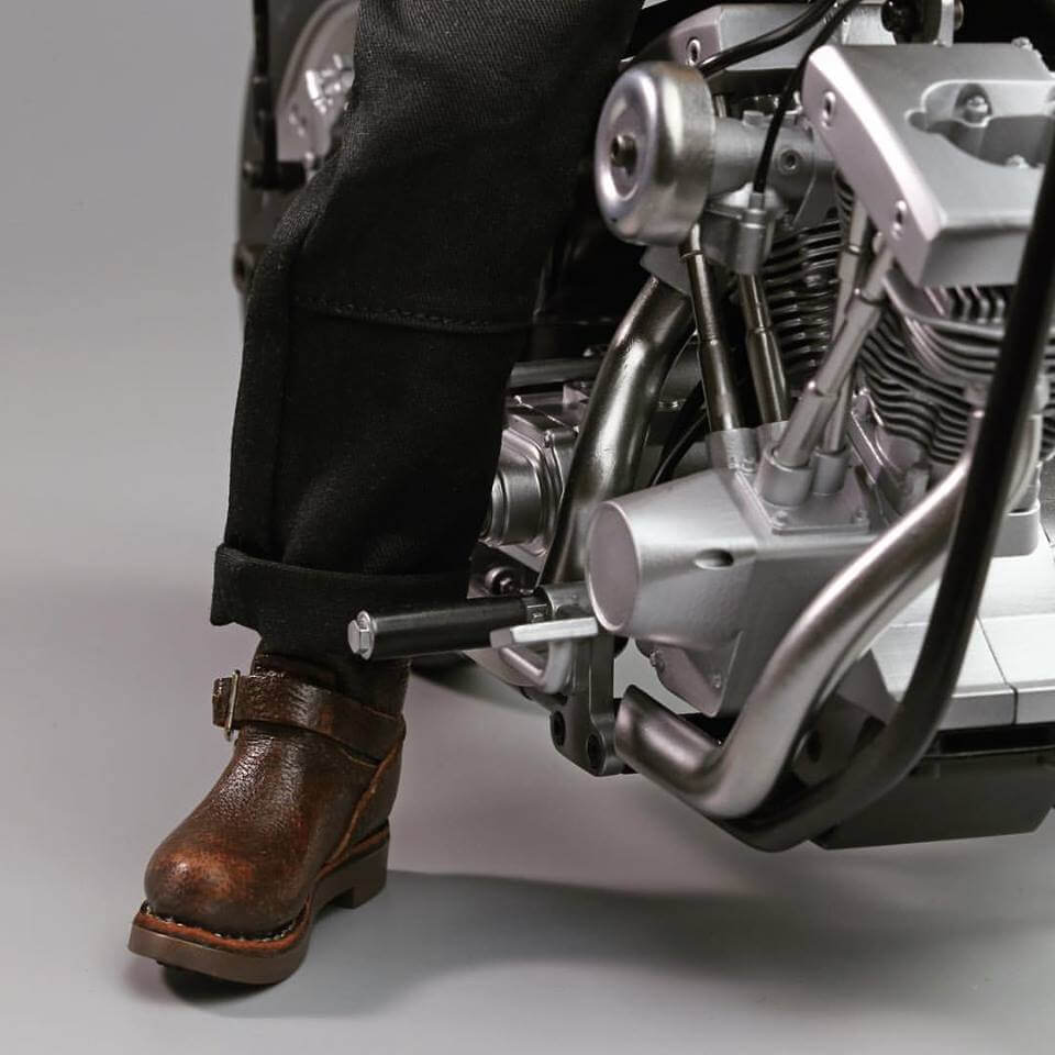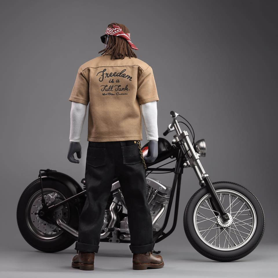 I started to make action figures of the Rider Collection since 2014.Scott is the 3rd Character of this collection.I have been looking for inspirations from Motorcycle Culture.Scott is a motorcycle modification mechanic.He wears work shirt, deck trousers, and worn-out work boots.Also the red bandanna shows his profession which is to keep his hair not falling down while working.You see Scott is wearing sunglasses, as he loves cycling very much.I designed a custom motorcycle specially for Scott, then I made it.The motorcycle makes him look so cool.I always try to present all the details by handmade approach.