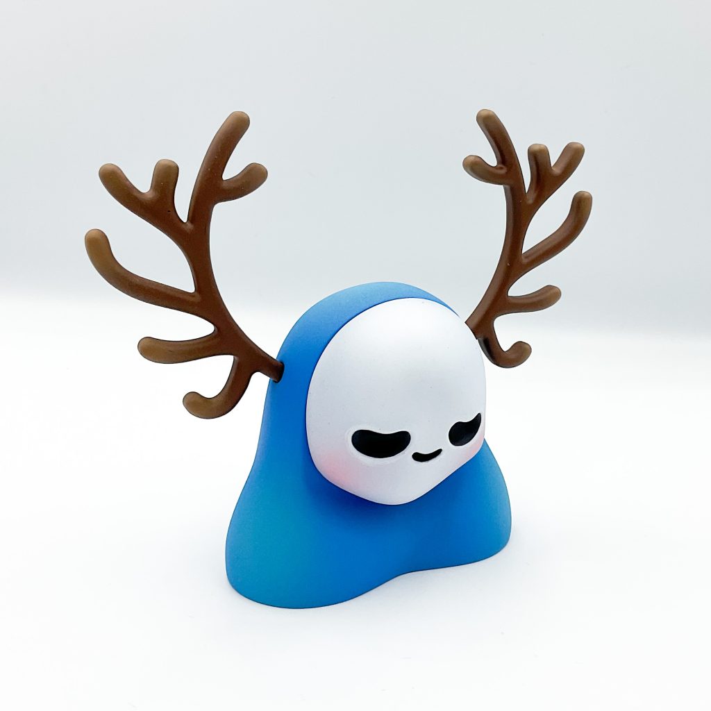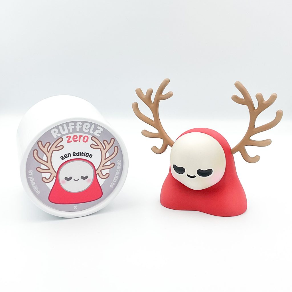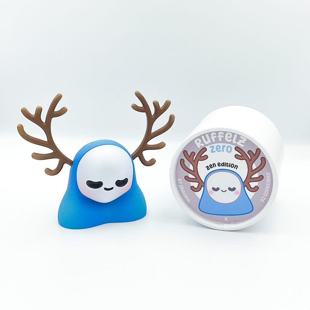 We first had a taste at the surprise debut at ToyCon 10, back in April but now the time has come for these two UK maestros to combine and present to you Ruffelz Zero Zen edition! Jaykishh and PJ Constable bring you The Ruffelz character! Originally designed by Jaykishh and has been released in various forms throughout his art toy career. Through this new partnership with PJ Constable, Ruffles Zero was born. Featuring removable antlers and a magnetized face sculpt which can be rotated, we have designed this piece to be fully customizable and lend itself to various iterations and face sculpts provided by a range of talented artists we will work with to grow the Rufflez Zero Line up!”