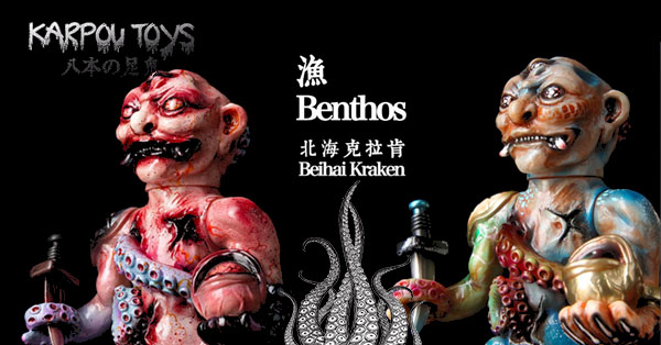 Sofubi toy designer Karpou presents the Octopusmonster in two different versions, Kraken/Benthos. Get ready to live true aventures in the depths of the ocean, but beware, something hidden in those waters might change you, just look at Karpou.