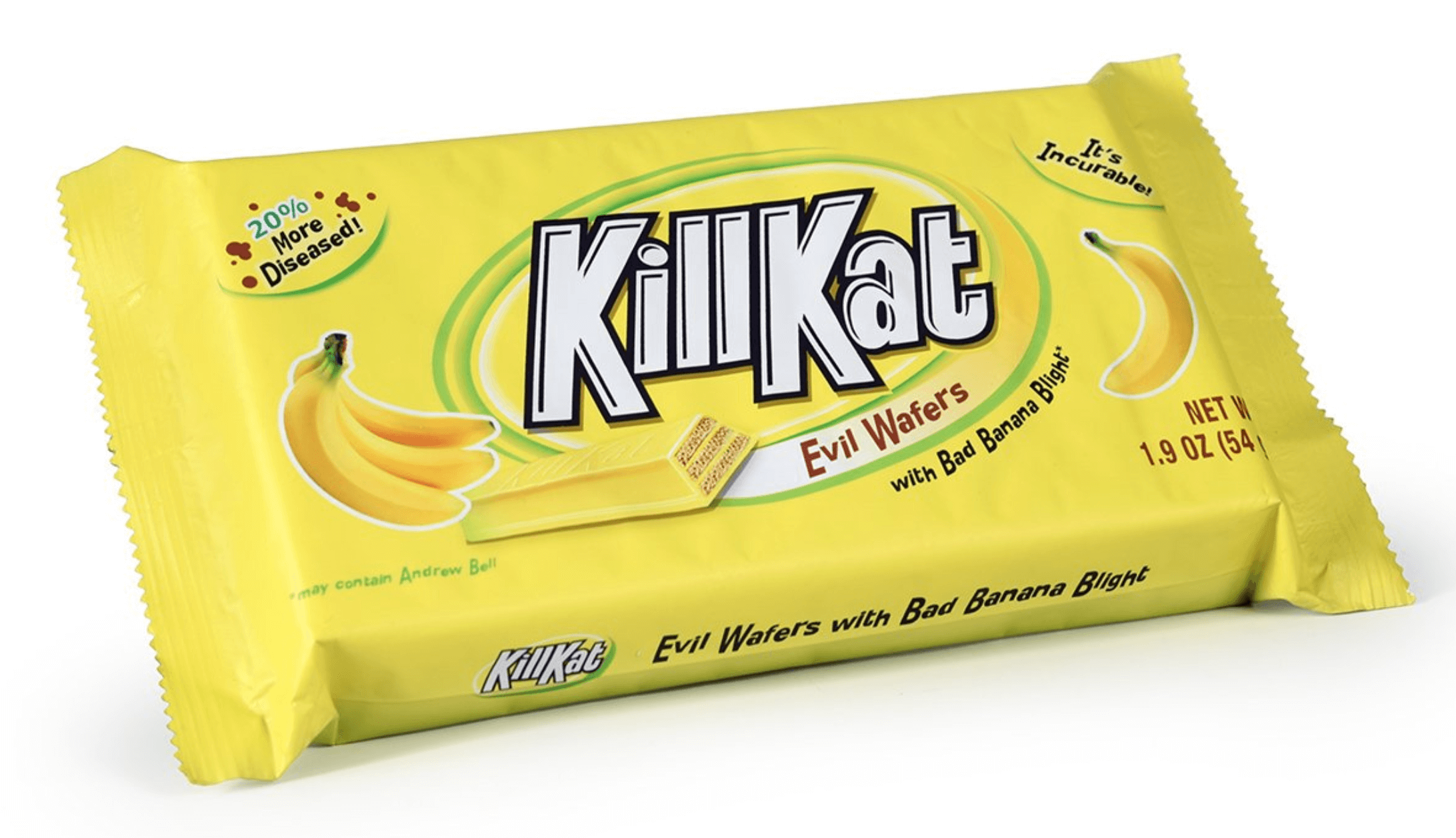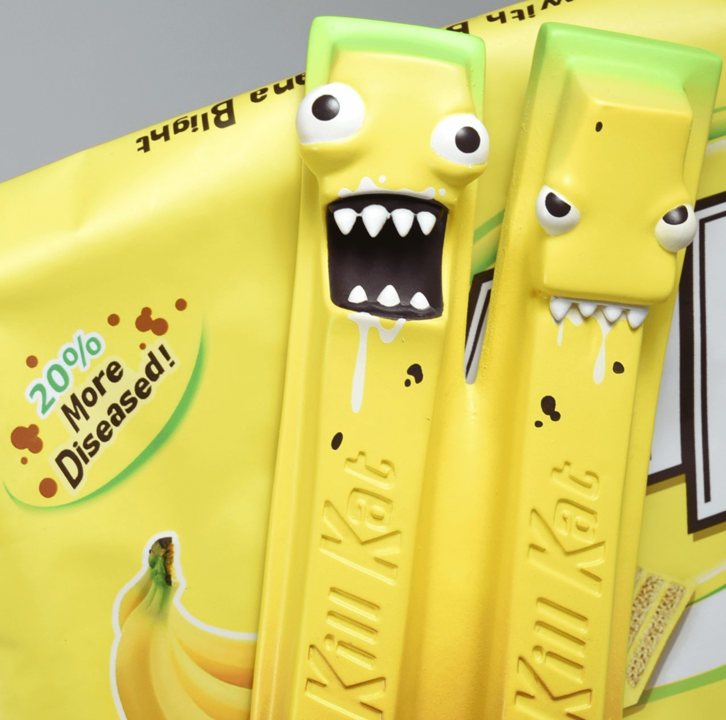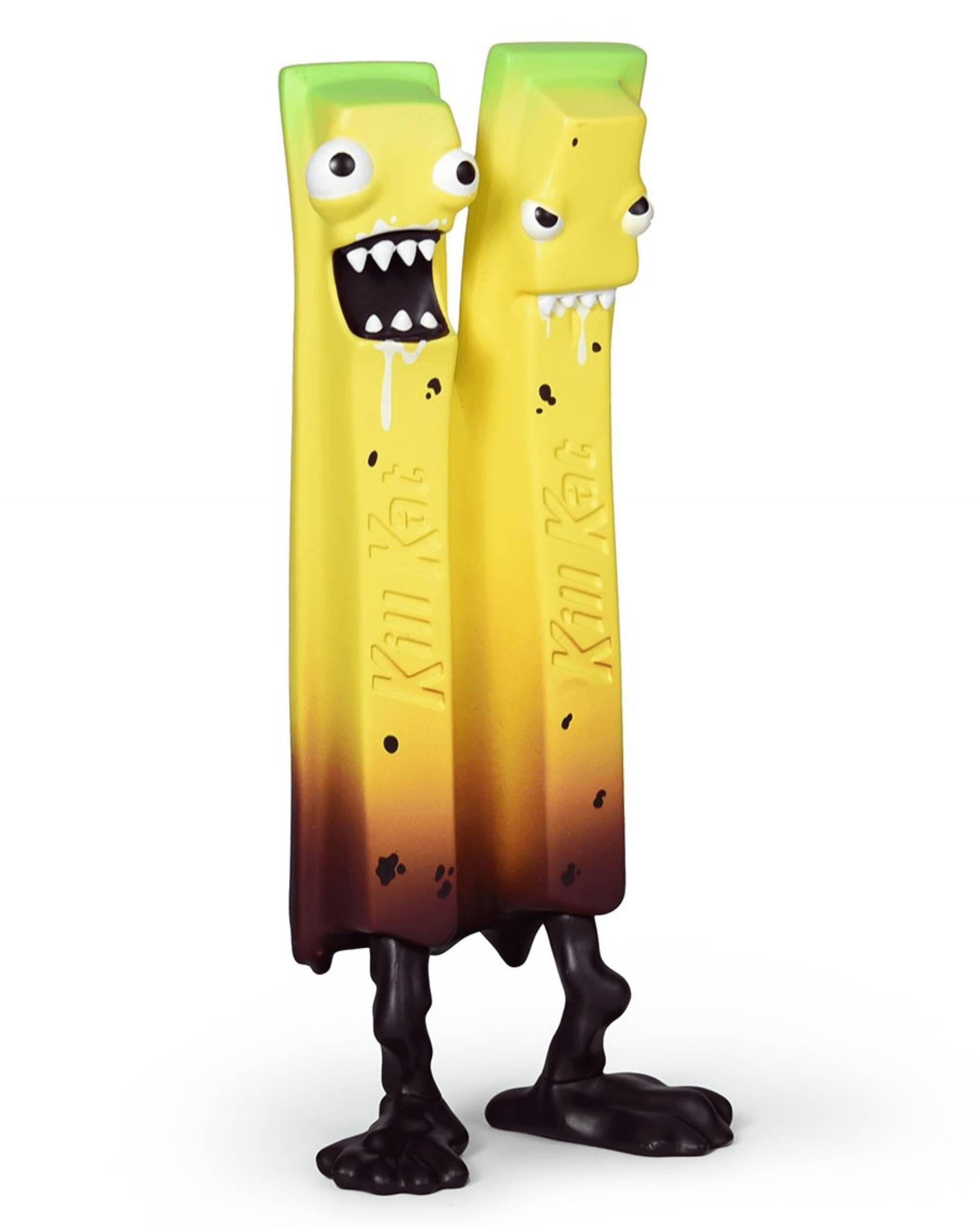 MORE FLAVOURS incoming! The Designer Toy Awards A Toy of the Year 2018, Andrew Bell “Kill Kat” has gone bananas. We all know Japan as all the crazy and mad flavours and it looks to be the same for Kill Kat as Andrew Bell announces the all new Bad Banana Blight edition as a part of Nerdy Collectibles EXCLUSIVE. Have a break have a Kit Kat….. Wait……. Andrew Bell’s Kill Kat’s invasion has spread and taken over the confectionery world! #FAKENEWS You might not want to take a bite outta them as they might give you the deadly bite! Last year saw the OG release of the Kill Kat and we couldn’t resist buying one ourselves.