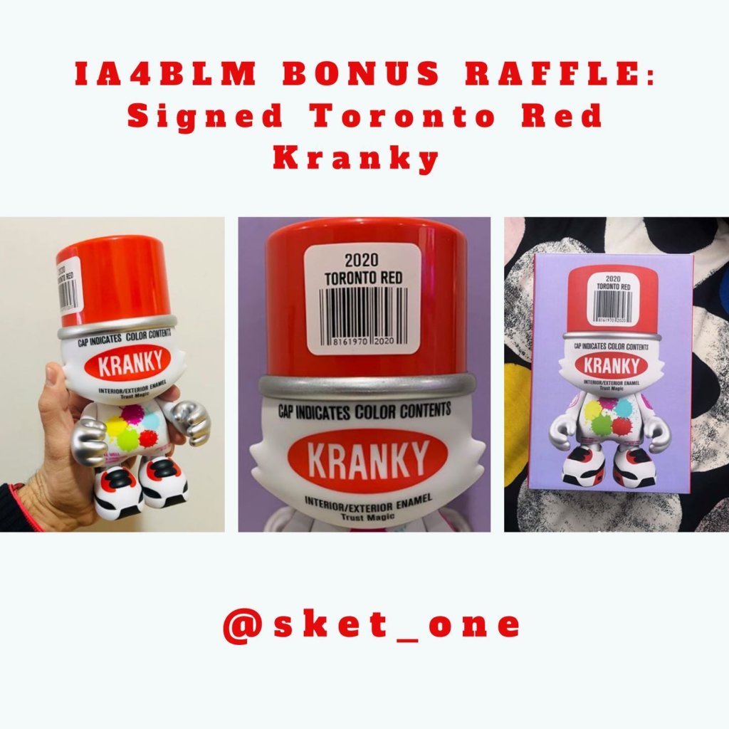 We have a donation of a signed Toronto Red Kranky from Sket One that will work as unifying donation piece. For every $20 that someone donates to any of our other artists, that person will receive a bonus ticket with a unique number to be entered into Sket’s raffle. We will list an example donation and how it would be broken up at the bottom of this FAQ