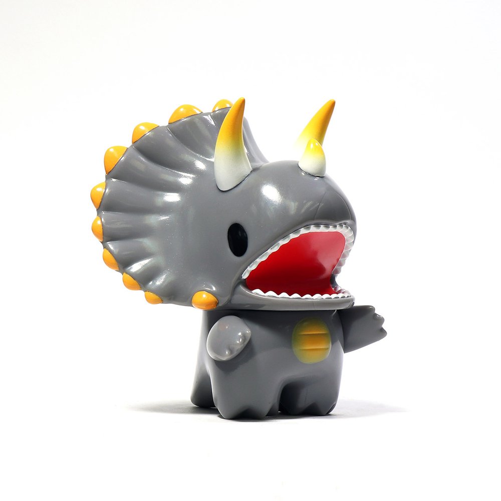 Last year we saw the prototype in person and got all hyped up about Ziqi’s adorable addition his Dino series with TriDino. New editions have been made available for conventions around the world but this weekend will see this version TriDino being made available online! Already having the pinkPOP version and the citrus colourway this week will see one of the more masculine colourways, HA. Maybe TriDino’s been having too many BBQ in the summer sun and the charcoal from the BBQ has turned him into a shade of Granite? Who knows, all we know he’s cute as ever.