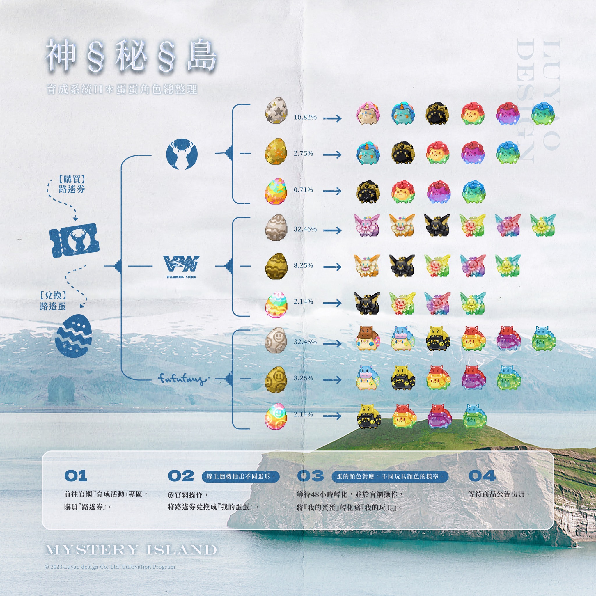 Cultivation Program on Mystery Island has officially begun! Taiwans 路遙圓創 Luyao Design has called upon local artists to take on the labs to present to you special Unicorn, Hibbo and Bunny! artist VIVIAN WANG Studio and fufufanny both go deep into the Cultivation Program where Luyao has made a series of random and rare species that can be found on Mystery Island