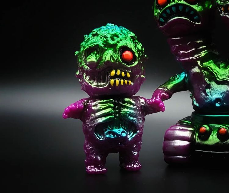Mickey the mastermind behind Deathland Vinyl Toy creator of the iconic Ultra Stone Age Man (read HERE) is back with the iconic Mecha Twins, this time around treated with green, purple and blue metallic sprays, we’re sorry Eva 01m you can compete!