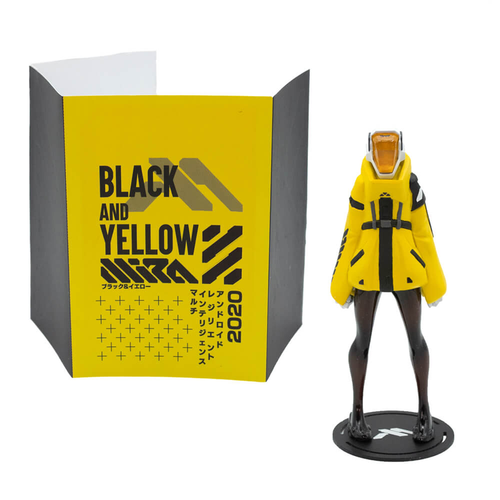 Mira Black & Yellow is an android teenager with a sleek physique and futuristic aesthetic. The included metal base is magnetic and secures Mira to the earth.