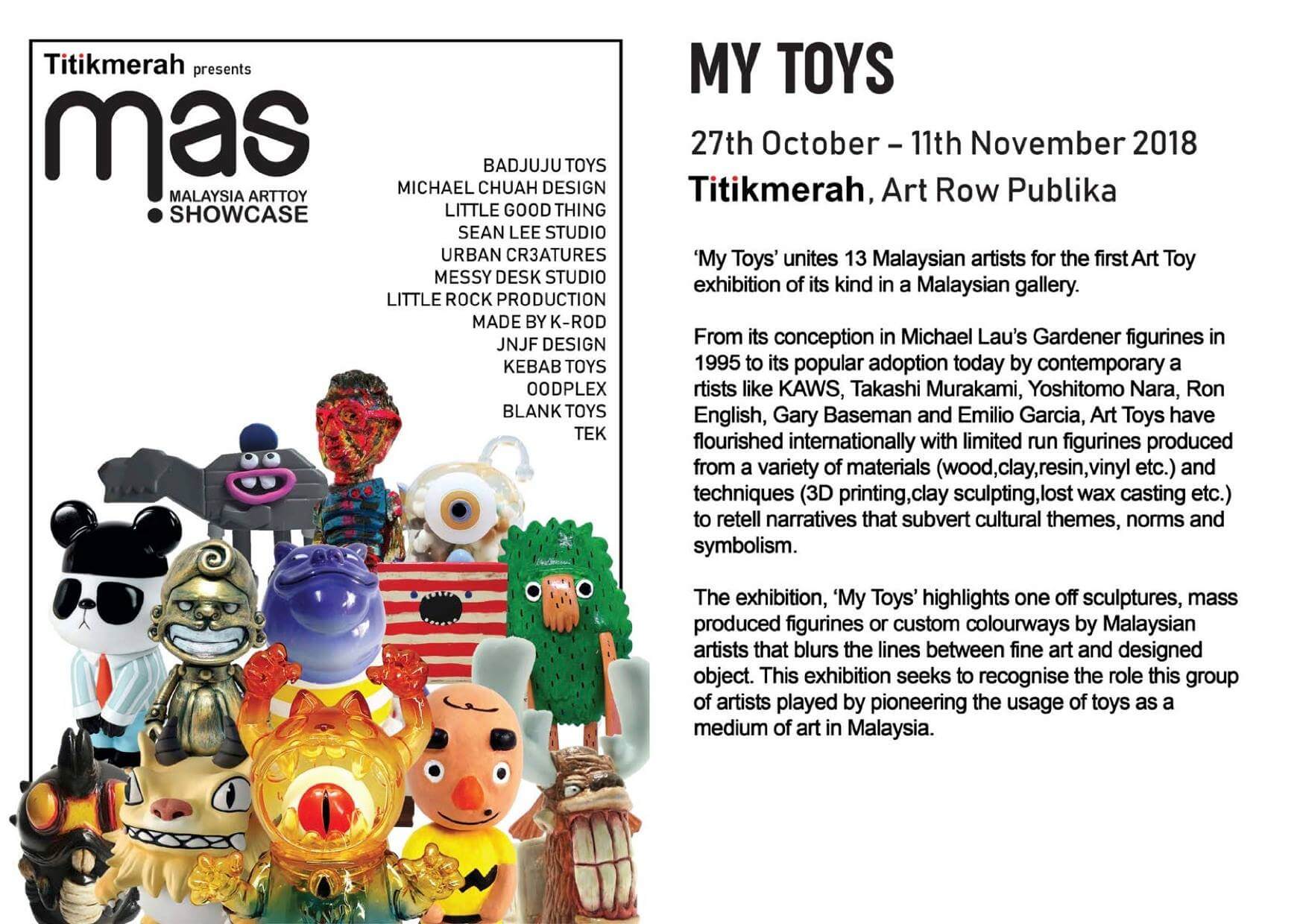 Today is the day where 13 local artists in Malaysia such as Badjuju Toys, Michael Chuah Design, Little Good Thing, Sean Lee Studio, Urban Cre3atures, Messy Desk Studio, Little Rock Production, Made by K-Rod, JNJF Design, Kebab Toys, Oodplex, Blank Toys and Tek. Doors have opened and all the artists are showcasing their art at Galeri Titikmerah. Today will be the day where you can meet some of the artists in person at the show whilst enjoying all their art pieces. The M.A.S collective has been busy travelling around Asia at certain conventions and now its time to bless their own county with the help of Galeri Titikmerah, giving back to their motherland.
