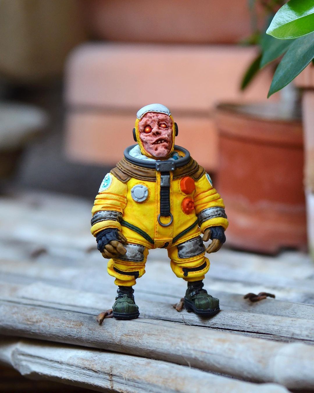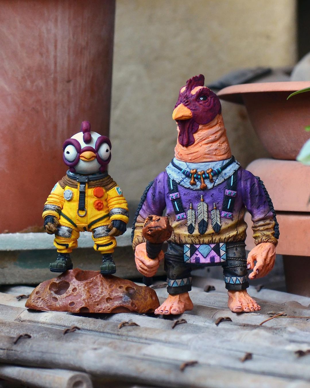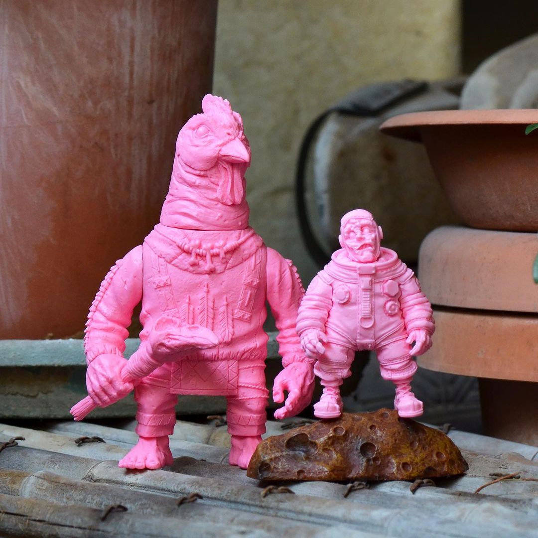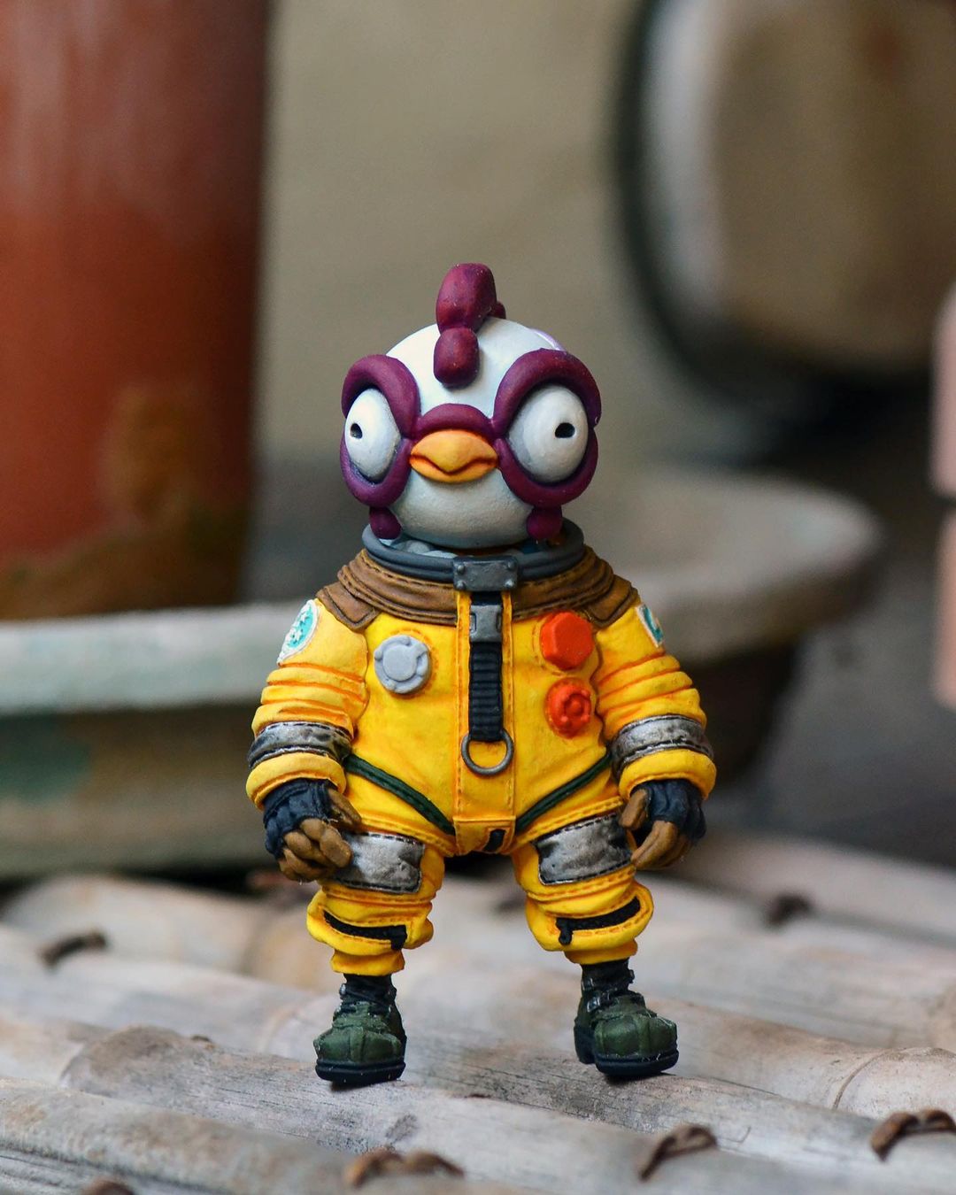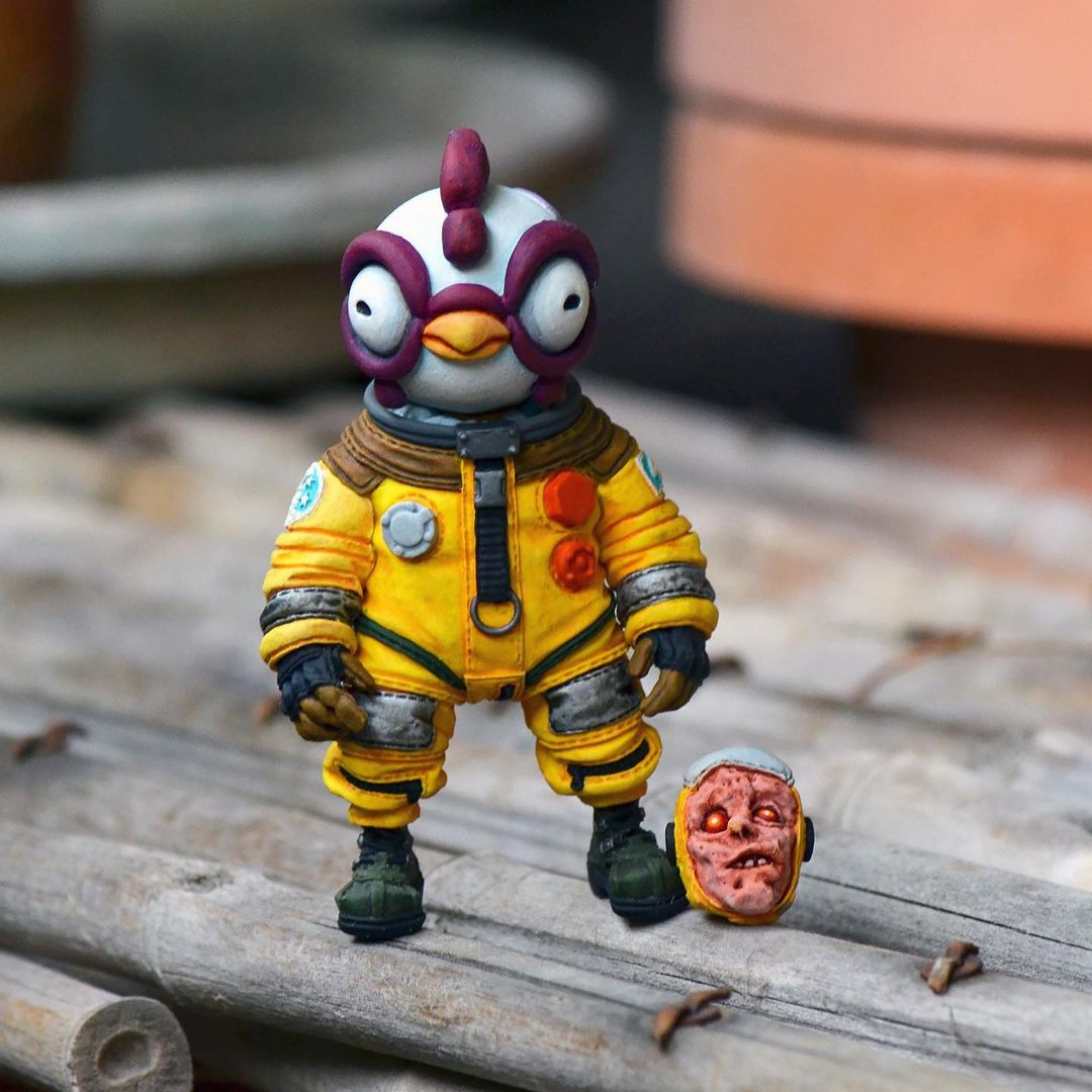 One wonders how everyone arrives on the exact same idea, a bugeyed chicken in a space suit.