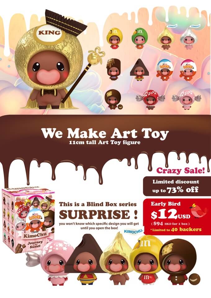 All the characters in Journey to the Sweet are made with candies. We have already created over 30 characters and this time we have launched a crowdfunding project to produce a series of art toys for one of our characters, KimoChu, the choco pig.