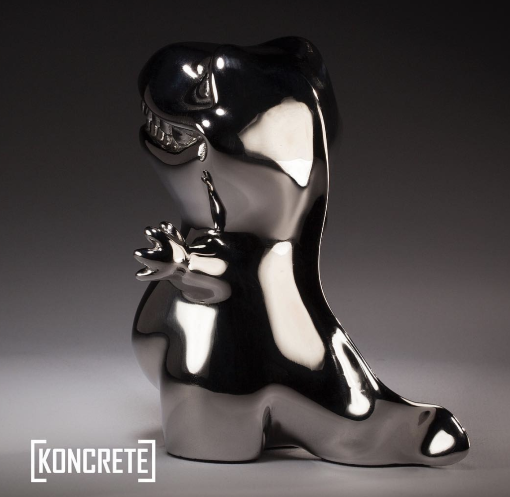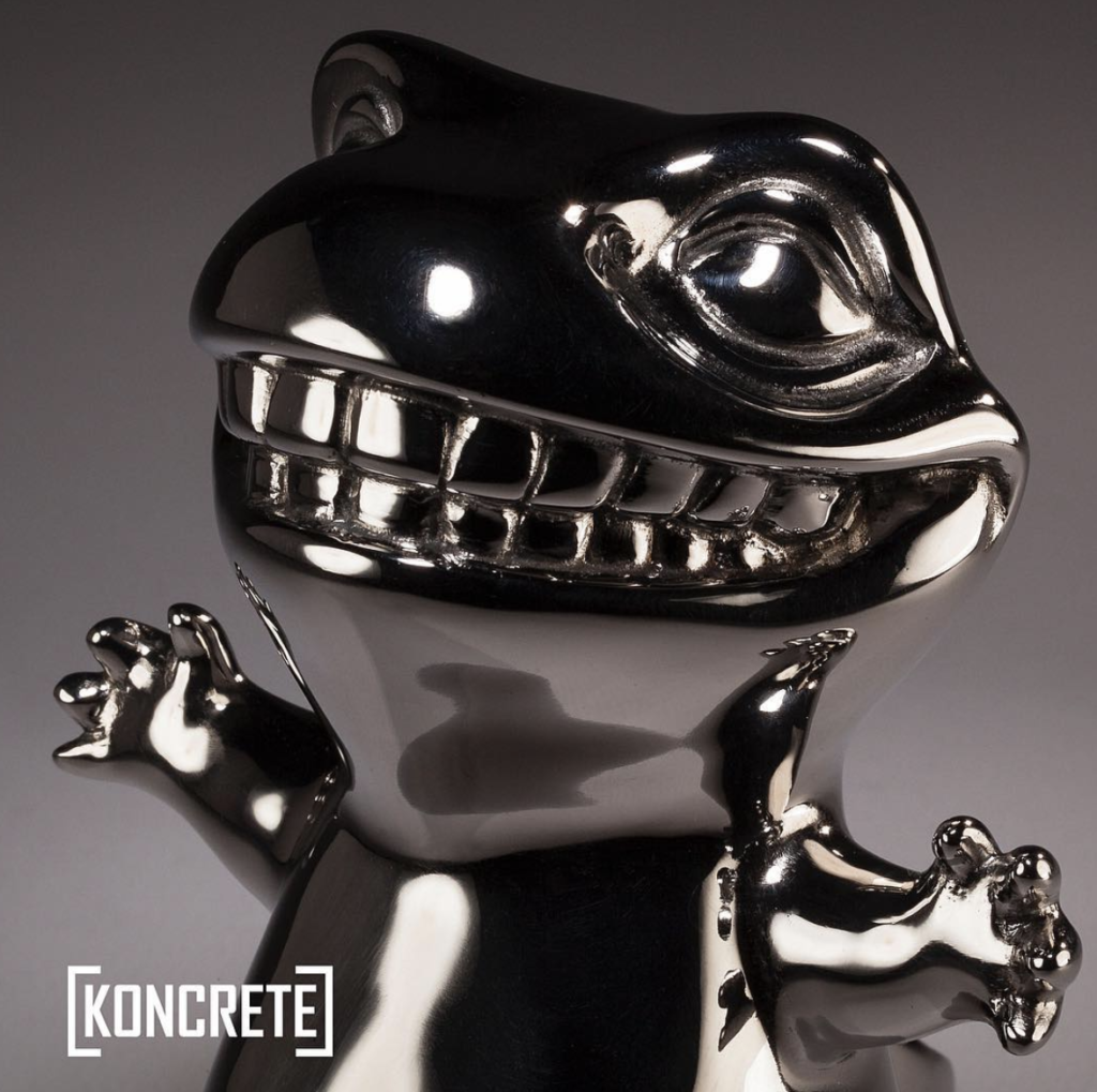 What’s hard, stands roughly 4-5″ tall, hard as nails, needs a rub once in a while and makes you smile when it’s staring at you? its NOODLE, of course, you dirty minded people! Ha. Over the past few days KONCRETE has been showing the Stainless Steel edition of his adorable and mischevious newt!