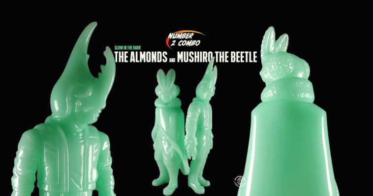 The long-awaited rebirth is HERE! From the masterminds behind the Gashadokutop, Ushi-Oni and our favorites Moth Twins and Mushiro The Beetle are back! Formerly Cereal Box Toys Go! Number 2 Combo is a collaborative effort between two Canadian brothers designing sofubi showcased Moth Twins and Mushiro The Beetle at Design Festa in Japan earlier in the year and now, in time for Halloween, Mushiro the Beetle and The Almonds return for their second release in green glow in the dark vinyl! Produced in Japan and designed by Number 2 Combo.