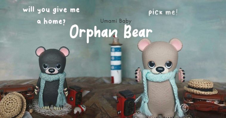 Singapore based Umami Baby whos most known for her dazzling Blythe doll customs launches her own art collectable that surely will pull on the heartstrings. Meet truffle and cocoa the Orphan Bear. The eyes and that hint of vintage style along with the story captured our hearts here at The Toy Chronicle. He’s available in two colourways — truffle and cocoa — and measures approximately 6″ tall. He has an articulated head and arms and will travel with his scarf (random colour).
