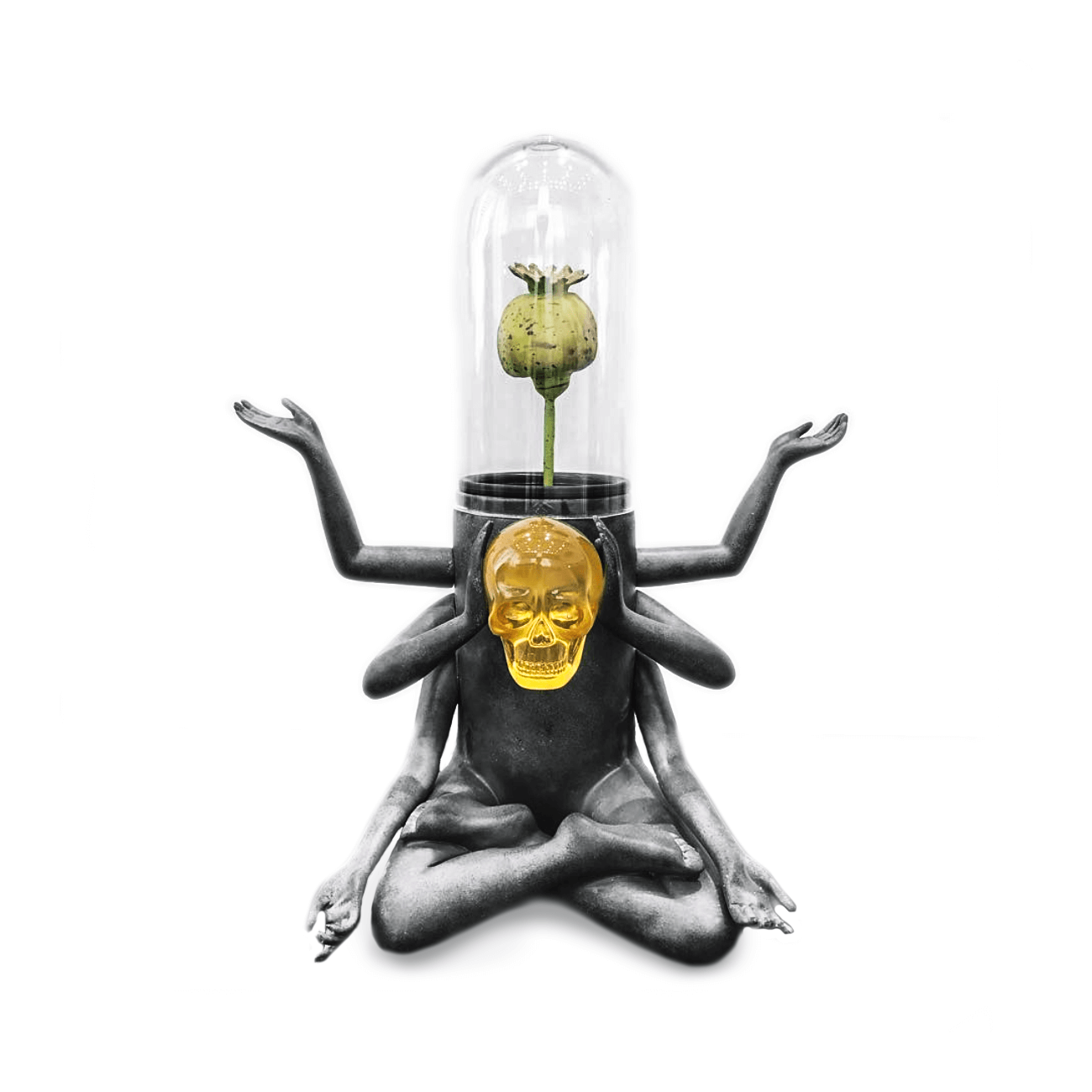 Hong Kong artist and LMF bassist Prodip Leung has teamed up with toy manufacturers How2work to release a limited edition sculpture named “Plants of Gods Terrarium.” Continuing his longstanding infatuation with extraterrestrial life and aliens, Prodip’s latest work sees a Vitruvian man-like figure sat cross-legged under an ornate plant piece.