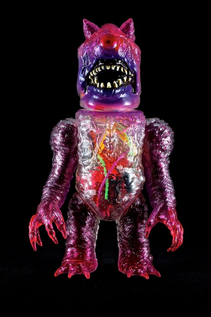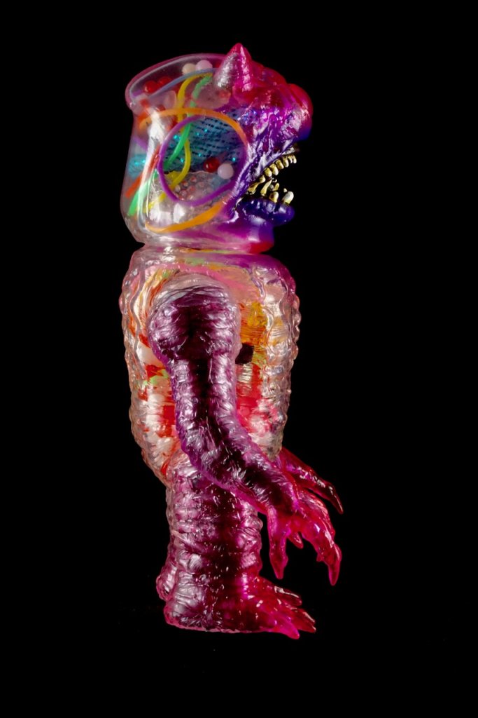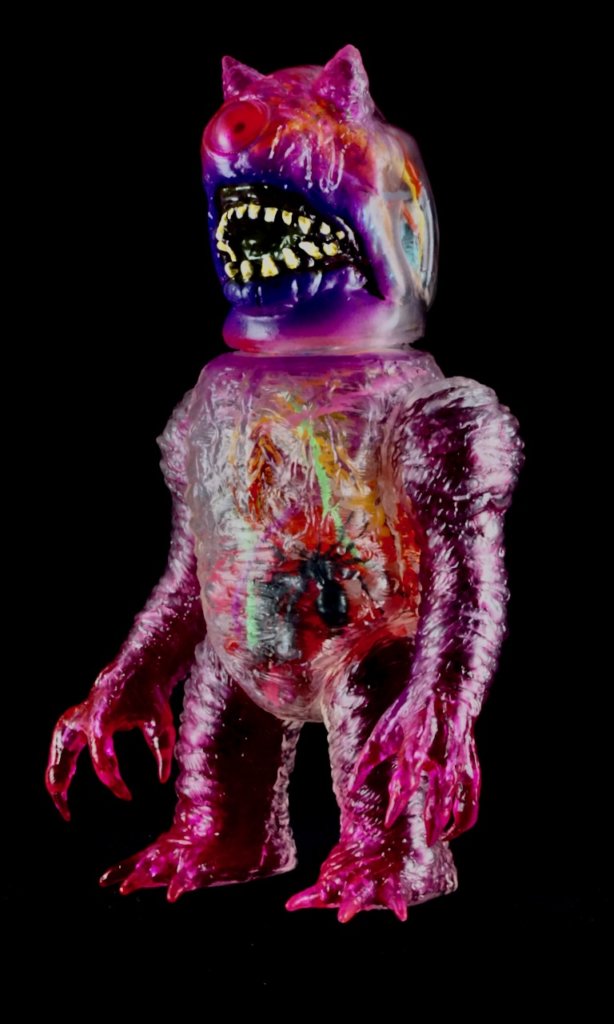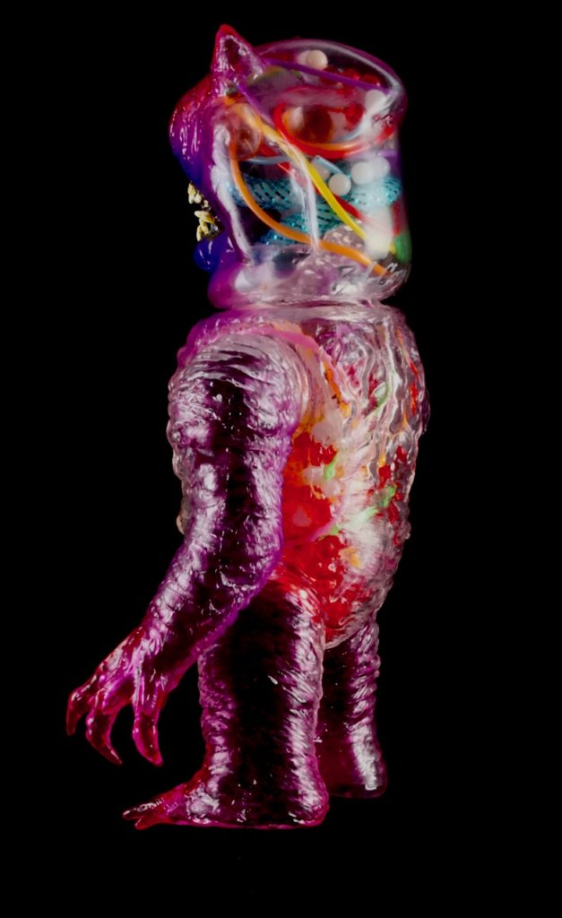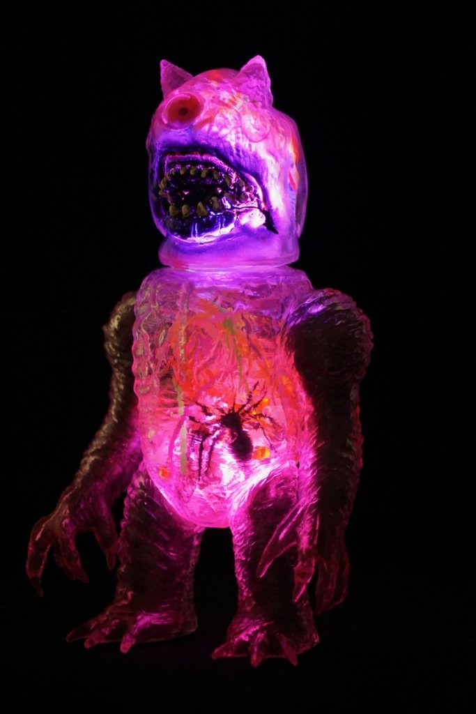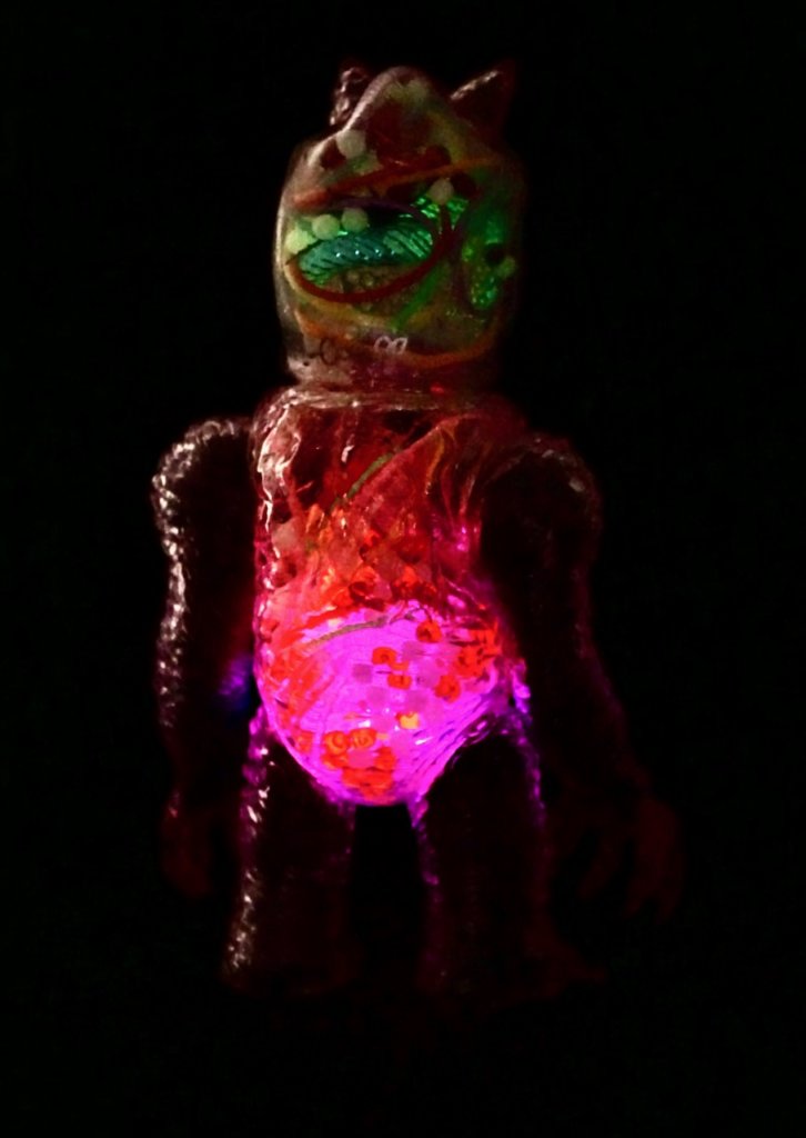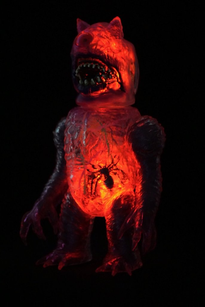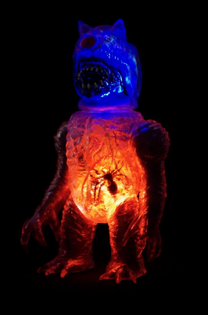 The “Electro Cyclops – X” Is a one of a kind custom of a Plaseebo clear vinyl Cyclops head on clear vinyl SHB X body. Strands 8 1/2 inches tall featuring 2 motion activated color-changing LED units with replaceable batteries, an inset eye and is filled with monster guts and a spider or two.
