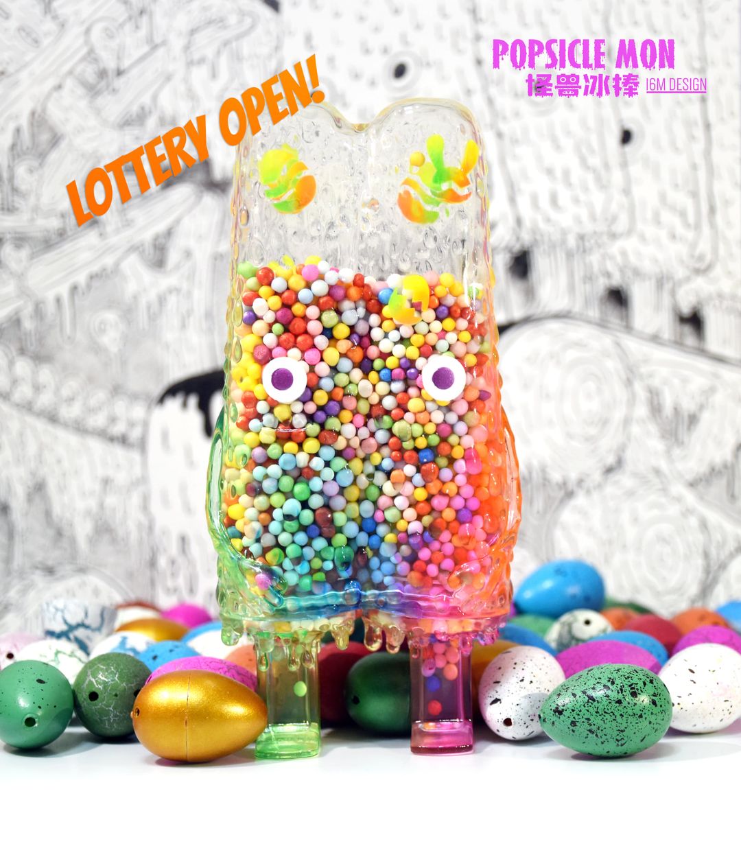 Easter might be over for the year but that hasn’t stopped us from wanting to lick Popsicle Mon! Our alternative to the Easter Egg is 16M Design x Alieneyeland “Popsicle Mon”. Filled with Sprinkles the don’t melt away in the spring sun! Who’s ready for the BRAIN FREEZE? We are screaming “I SCREAM you SCREAM for POPSICLE MON!” It’s true, 16M Design x Alieneyeland returns with a new POPSICLE MON, this time around destroying various candy in its path, sprinkles to be exact, HA.