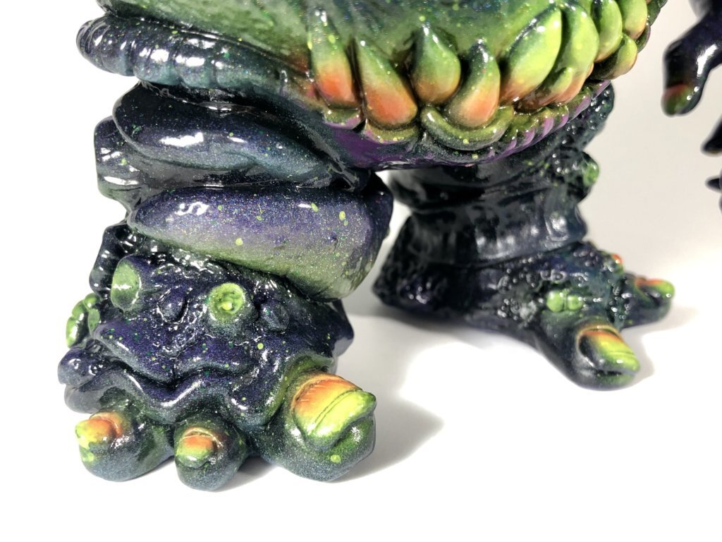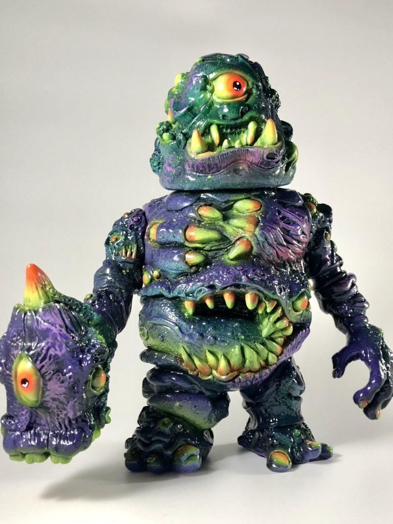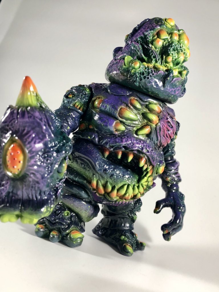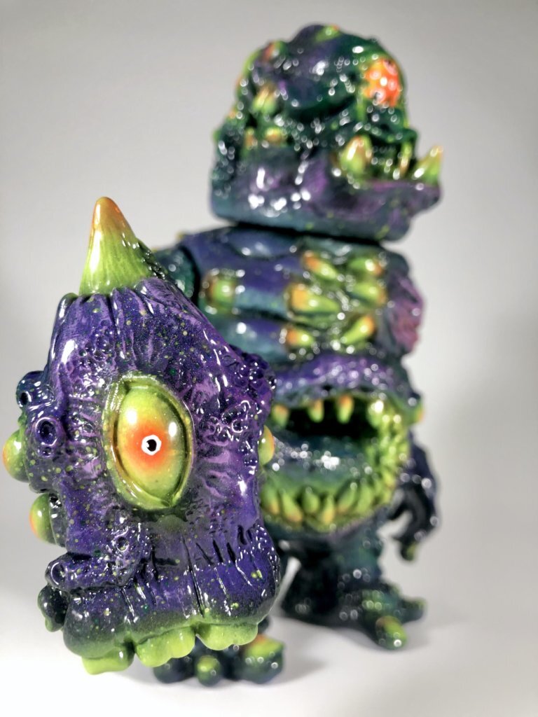The first painted version of Radiodecay Mawklops by Uhh, Sure Monsters is due to drop this coming fine weekend. Painted with Mad Ape Ninja vinyl paint, acrylic for details and drybrushing, color changing flake and black light reactive paints.