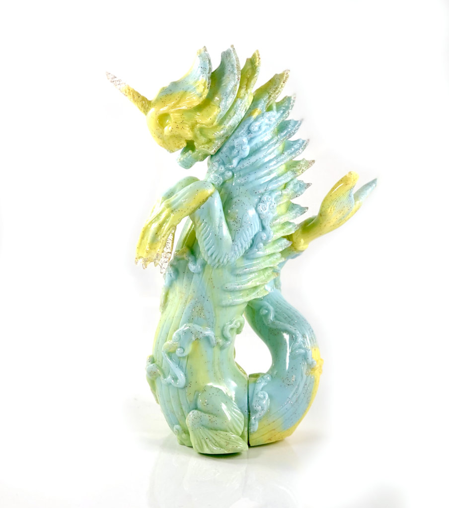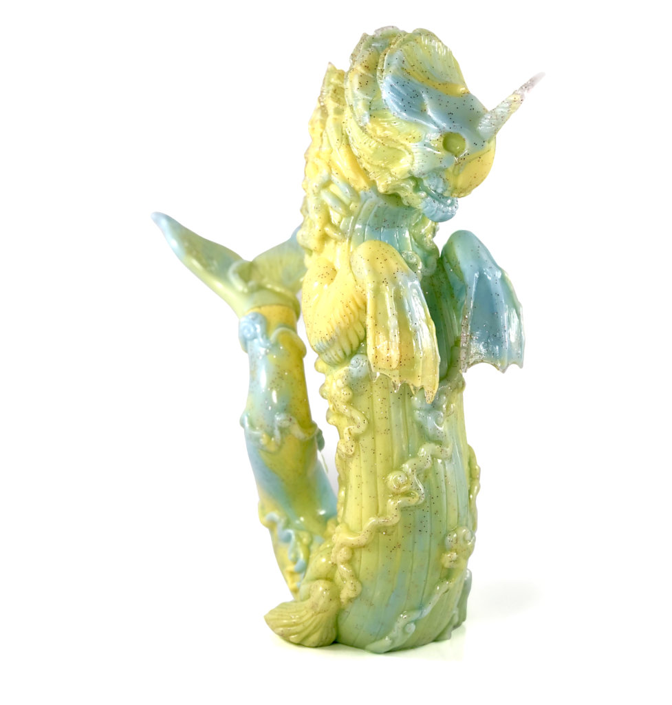 When the sea crashes against the cliffs, catches the sunshine in the most perfect manner, the colours of cliff, sea and sun combine and from there the Seafoam Specter is formed. It’s true. This is where the new Bake-Kujira by Candie Bolton comes into play. This new marbled pastel blue, pastel yellow, and clear vinyl with pink glitter Bake-Kujira is now available as a Lottery. We have details on how to enter below, but for now just let in this beautiful Bake-Kujira colourway sink in.