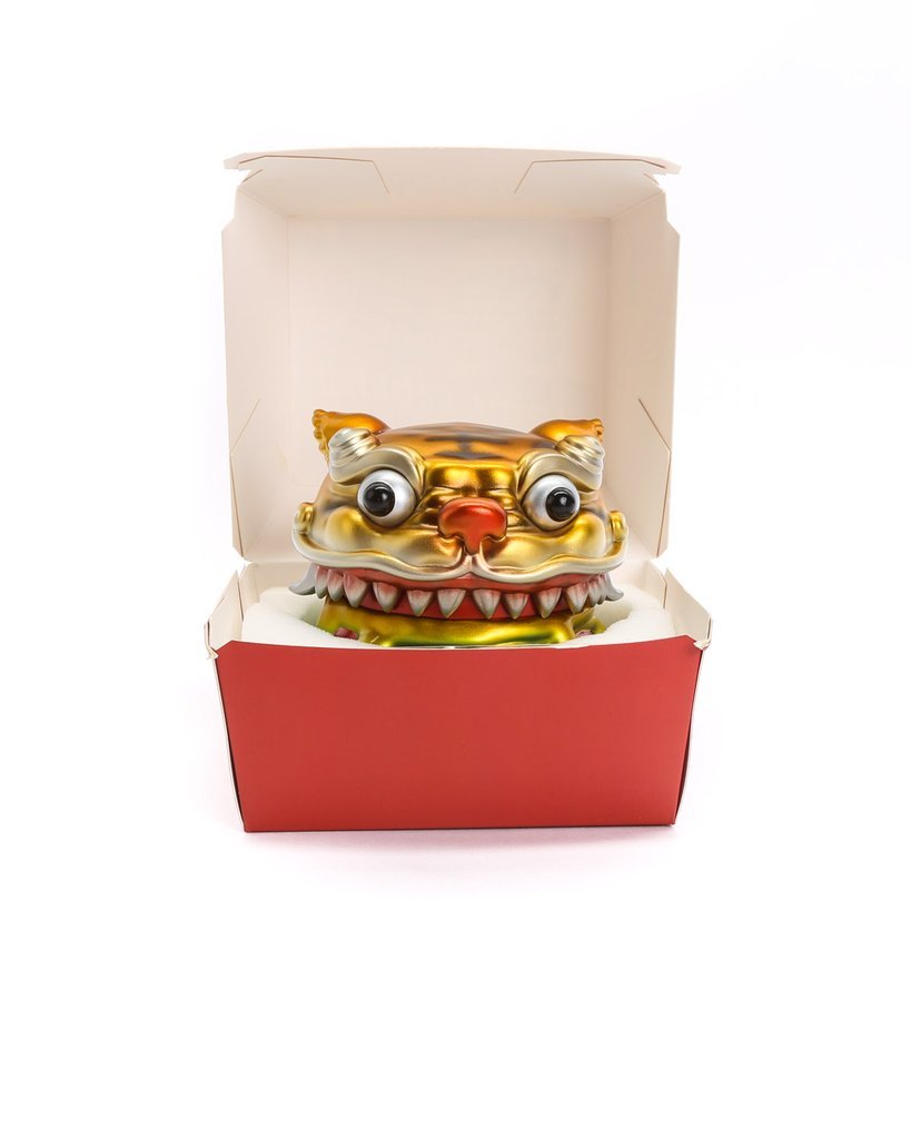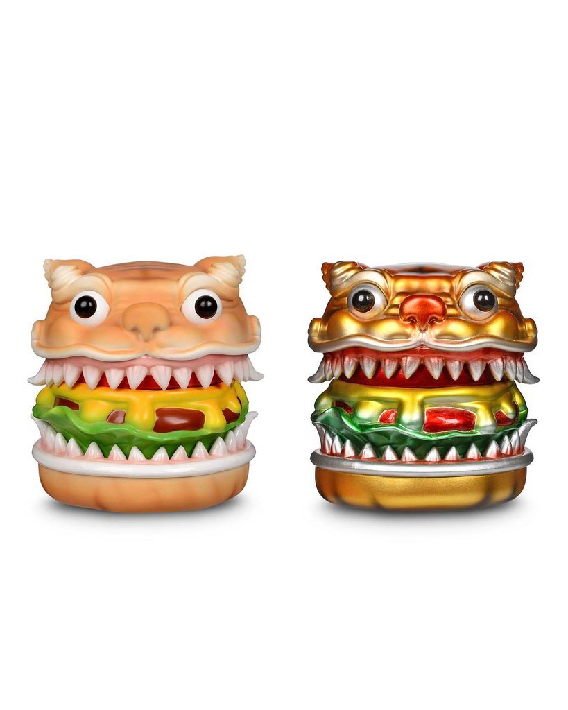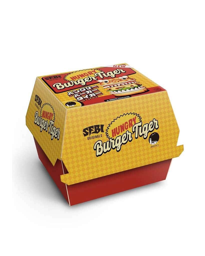 hungry burger tiger is the newest sfbi figure from chinese artist andy chen. with its curious eyes, wide mouth, razor sharp teeth and an endless appetite, the figure celebrates the joy of hamburgers. adding to the fun concept, hungry burger tiger separates into two pieces, a head with a tomato beneath it and the bottom with a slice of cheese on top. it also comes in a fun to-go style burger carton! oh, did we mention that there’s a gold metallic chase hiding within a few of those cartons? happy hunting!