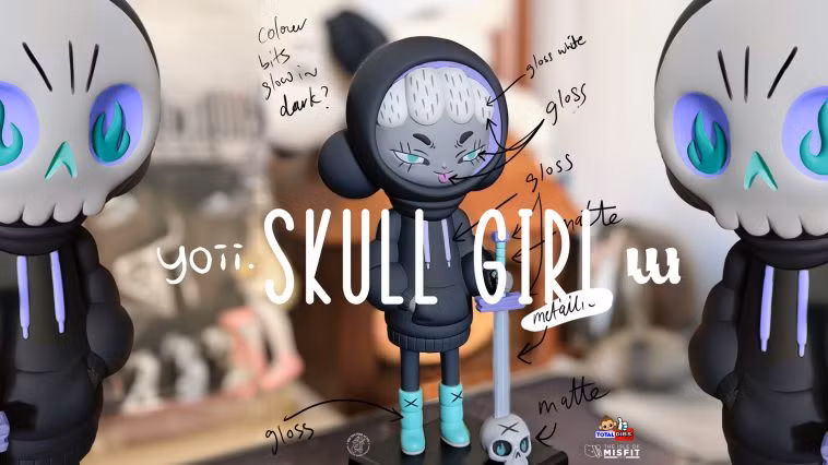 Yoii x Wetworks are offering you another amazing new character Skull Girl! Yoii is a professional tattoo artist, illustrator, toy designer, and street artist based in New Zealand. Skull Girl will join the original characters like Kidzilla, Gameragirl, and Pugrider!