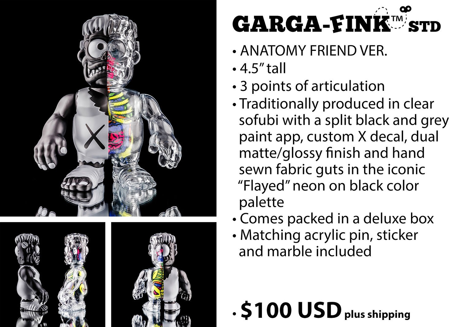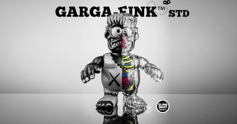 If the awesome Krazy Eyes STD Neon Nightmare Edition from mastermind Niall Anderson aka Tru:Tek the top guy behind Slingshot Supply Co! Check out this Garga Fink! Who turned on the nuclear-powered X-ray?! Who knows, all we know is GARGA-FINK has returned in the traditional STD scale for a very special deluxe release inspired by one of the indie toys’ most iconic releases, Kaws’ “Flayed” Dissected Companion!