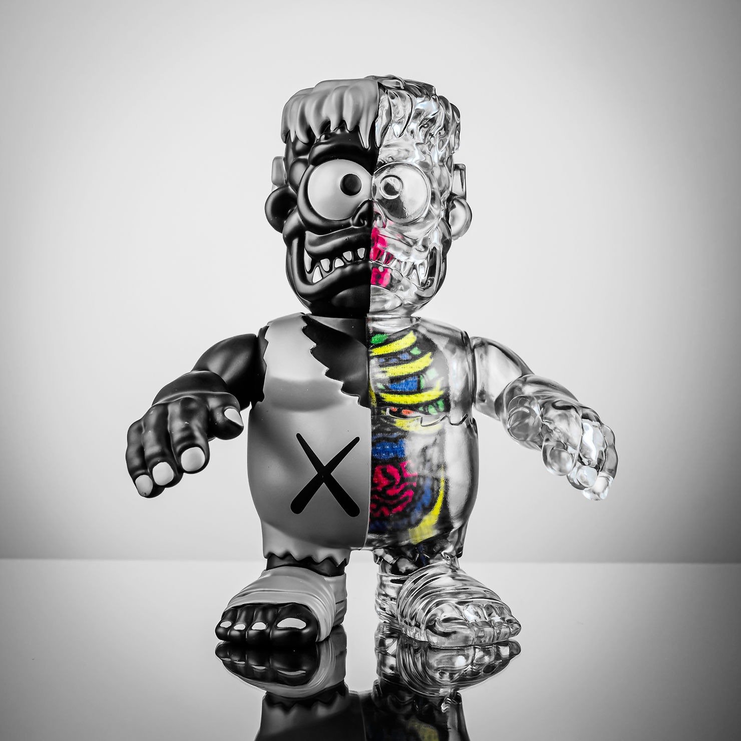 - Traditionally produced in clear sofubi with a split black and grey paint app, custom X decal, dual matte/glossy finish and hand sewn fabric guts in the iconic